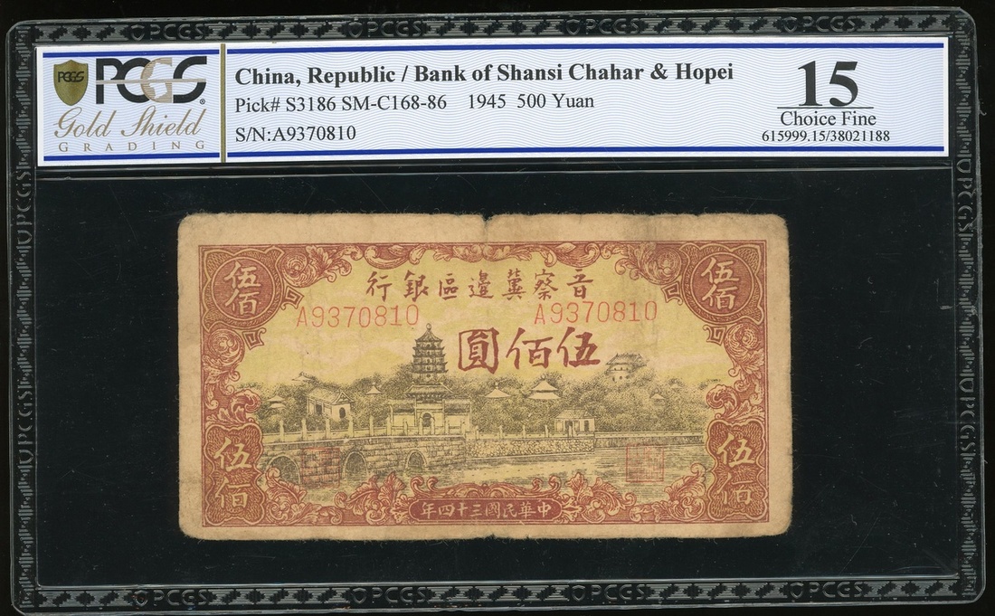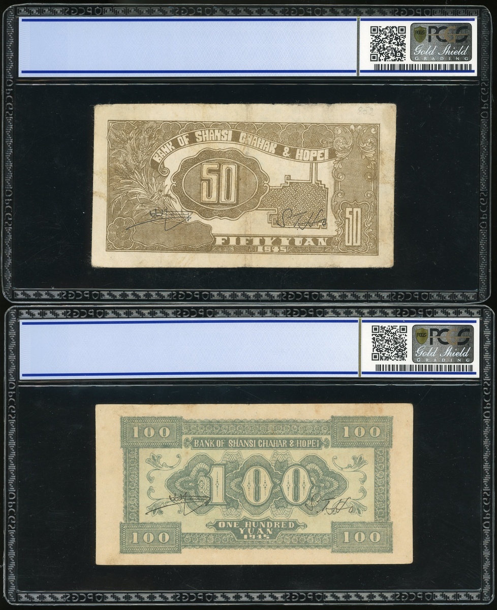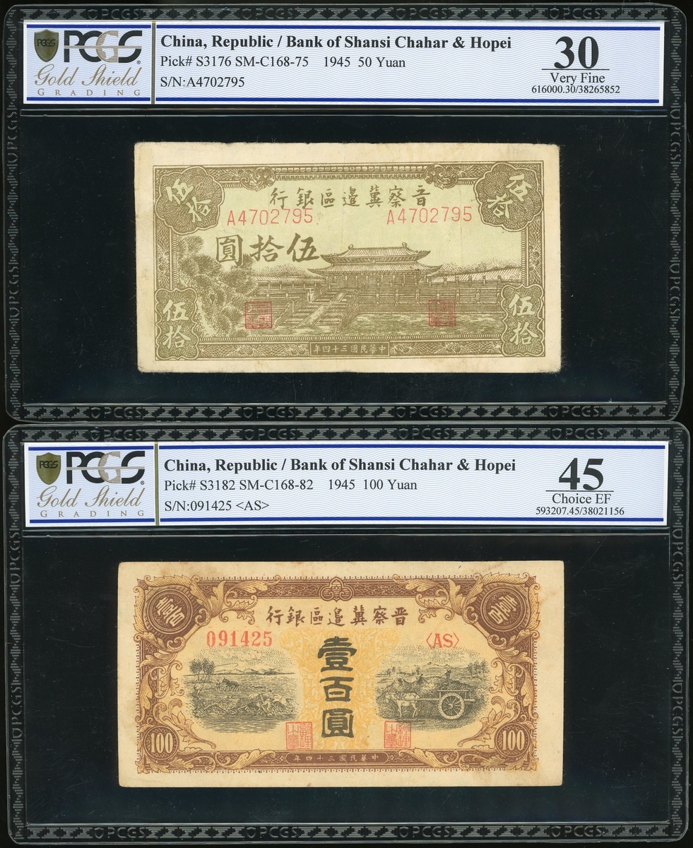 Bank of Shansi, Chahar and Hopei, 50, 100 and 500 Yuan, 1945, serial numbers A4702795, AS091425 and A9370810, brown on various underprint colours respectively, (Pick S3176, S3182, S3186), PCGS Gold Shield 15 Choice Fine-45 Choice Extremely Fine (3)