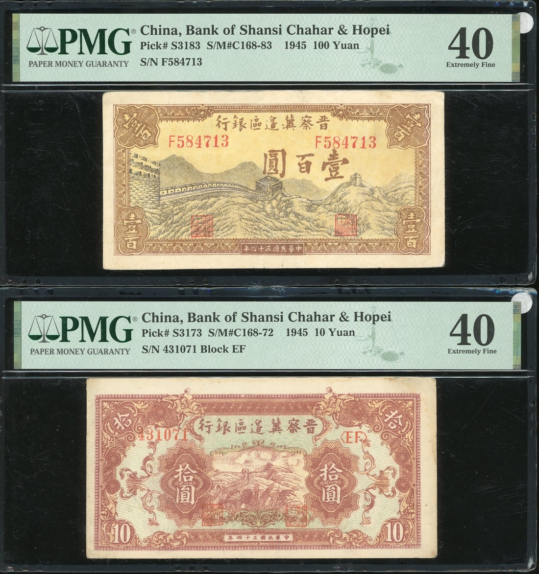 民國三十四年(1945)晉察冀邊區銀行拾圓及壹佰圓,一組兩枚,編號EF431071及F584713,均評PMG 40,壹佰圓評級註備(微裂)