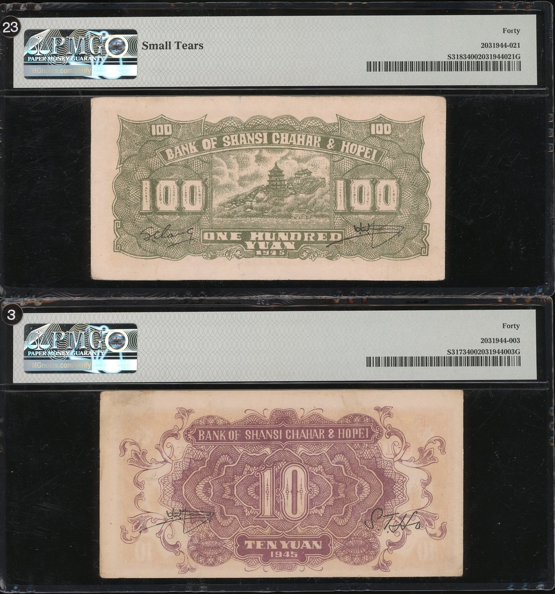 (Pick S3173 and S3183), both graded PMG 40, the 100 yuan has a 'Small Tears' comment (2)