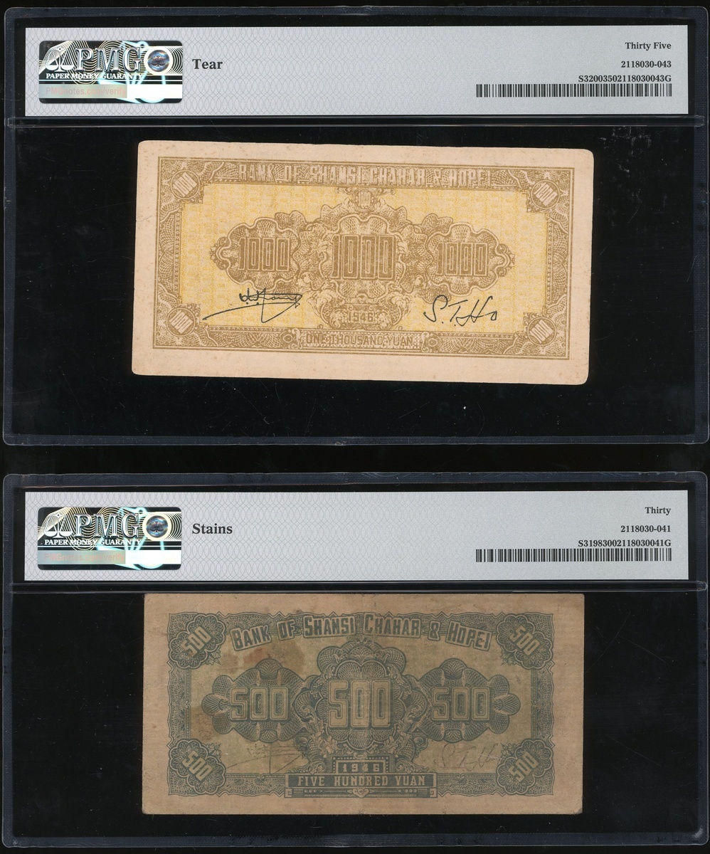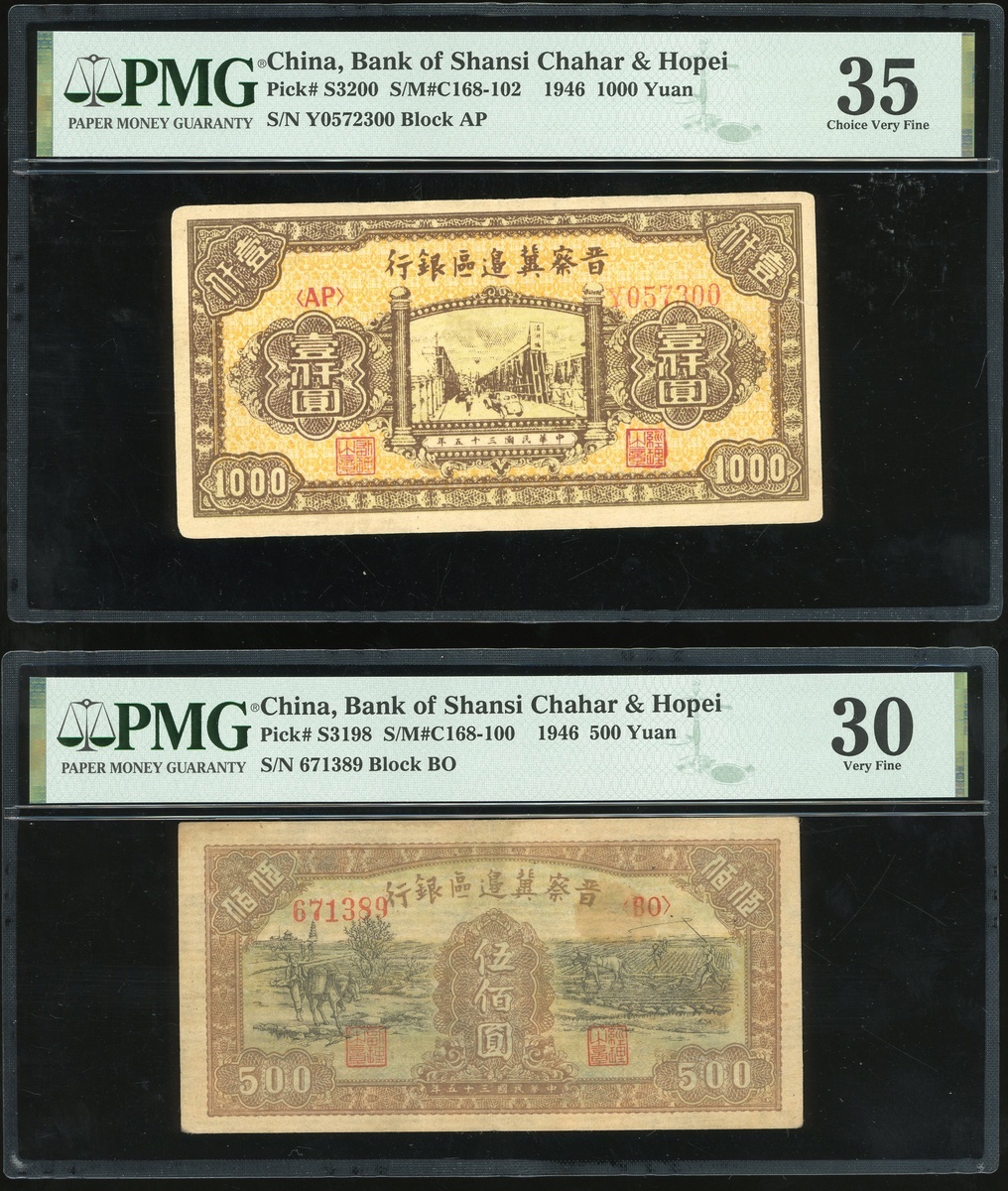 Bank of Shansi, Chahar and Hopei, group of 2, consisting of: 1000 yuan, Year 35 (1946), serial number Y0572300 and 500 yuan, Year 35 (1946), serial number 671389, (Pick S3200, S3198), graded PMG 35 (Tear) and 30 respectively (2)