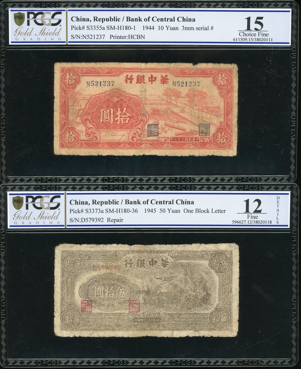 民國三十三及三十四年華中銀行拾、伍拾圓一組兩枚,編號N521237及D579392,均PCGS Gold Shield 12 Details-15,其中一枚有修補