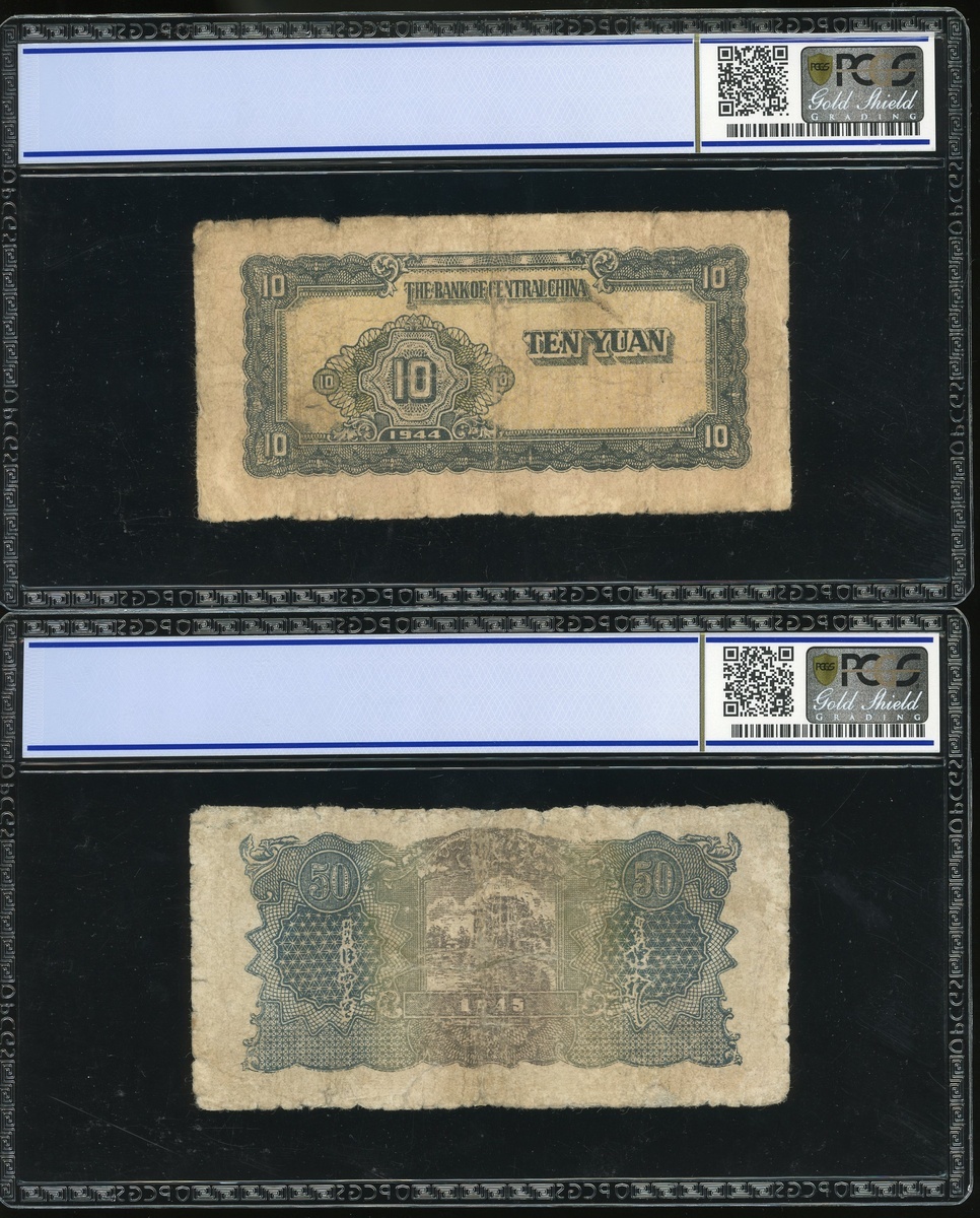 Bank of Central China, 10 Yuan, 1944 and 50 Yuan, 1945, serial numbers N521237 and D579392, red and grey respectively, reverse red, (Pick S3355a, S3373a), PCGS Gold Shield 12 DETAILS (Repair)-15 Choice Fine (2)