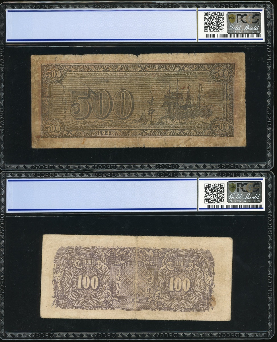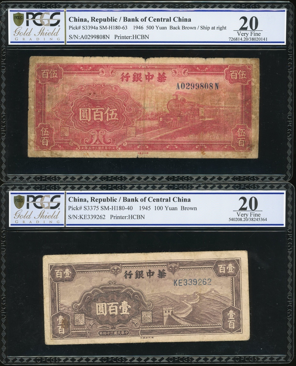 民國三十四及三十五年華中銀行壹佰、伍佰圓一組兩枚,編號KE339262及A0299808N,均PCGS Gold Shield 20