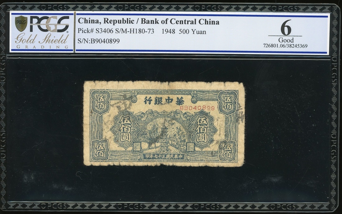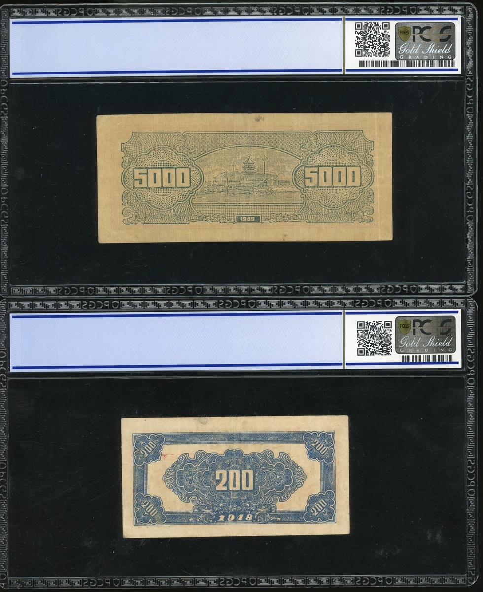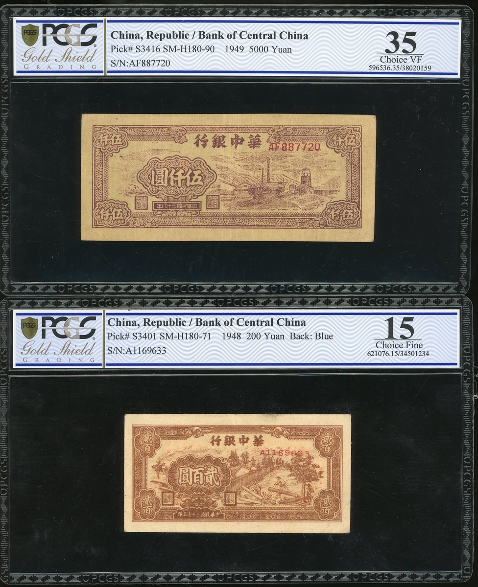 民國三十七及三十八年華中銀行貳佰、伍佰、伍仟圓一組三枚,編號A119633、B9040899及AF887720PCGS Gold Shield 6-35