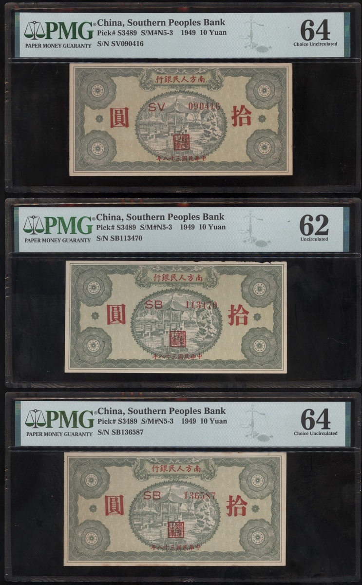 Southern People's Bank, lot of 3 10 Yuan, 1949, serial numbers SV090416, SB113470 and SB136587, green, pavilion at centre, (Pick S3489), PMG 62 Uncirculated (Minor Edge Damage)-64 Choice Uncirculated (3)
