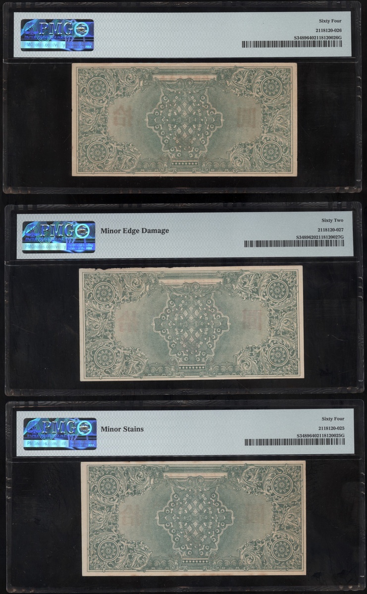 民國三十八年南方人民銀行拾圓一組三枚,編號SV090416、SB113470及SB136587,PMG 62-64,其中一枚邊有損
