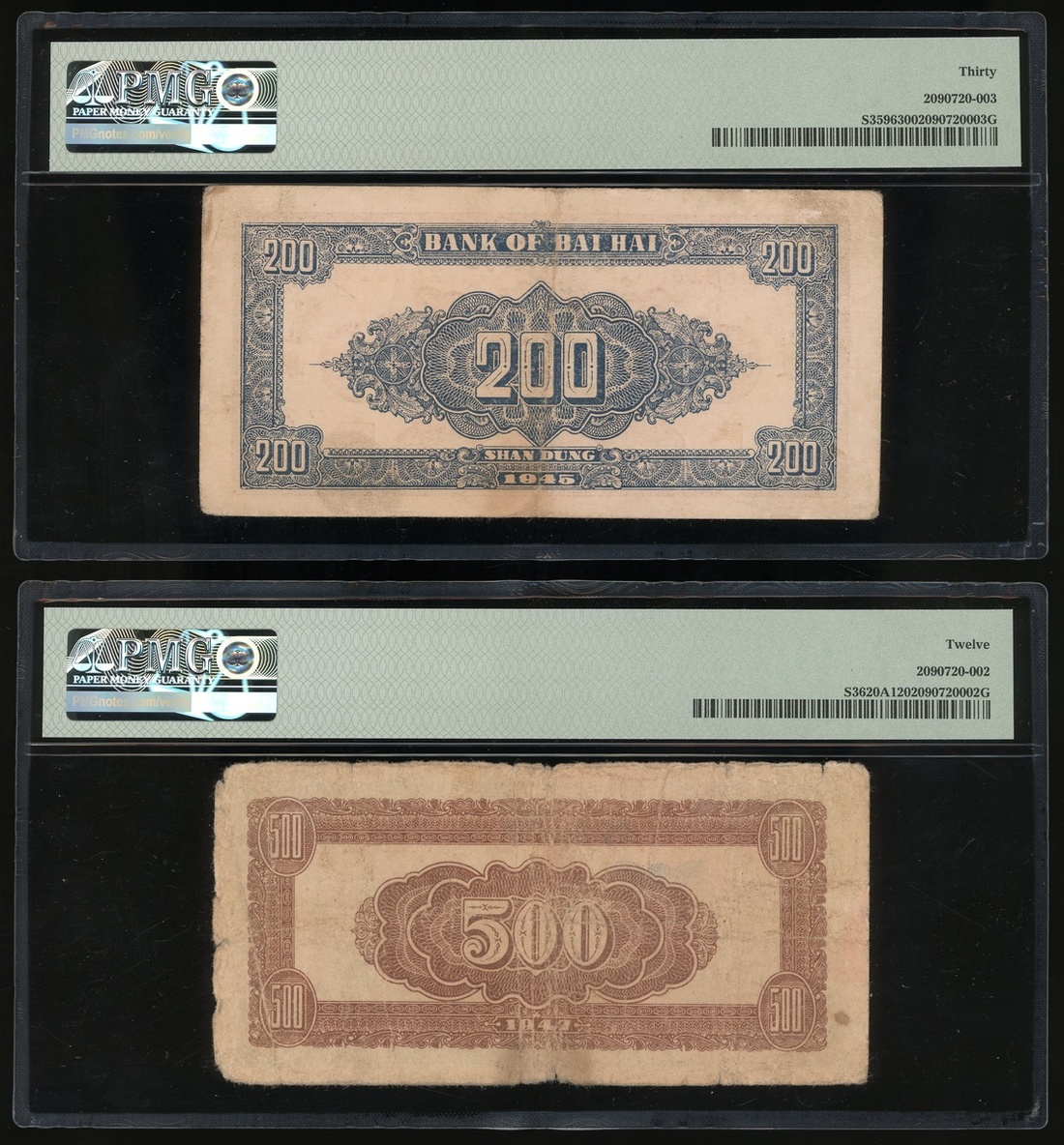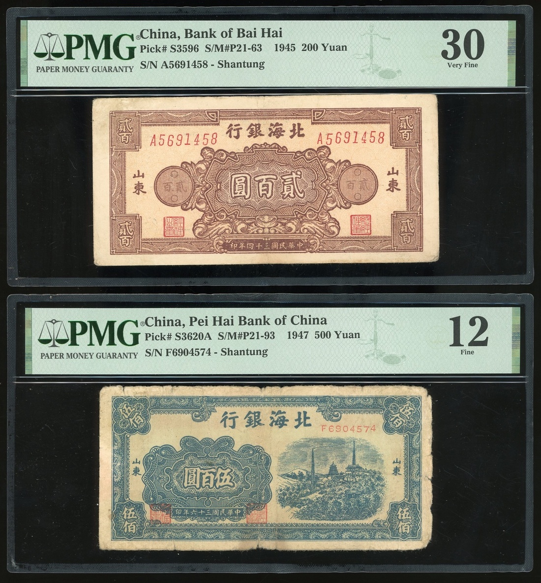 Bank of Bai Hai, 200 yuan, 1945 and 500 yuan, 1947, serial numbers A5691458, F6904574 respectively (Pick S3596, S3620A), graded PMG 30 Very Fine and 12 Fine (2)