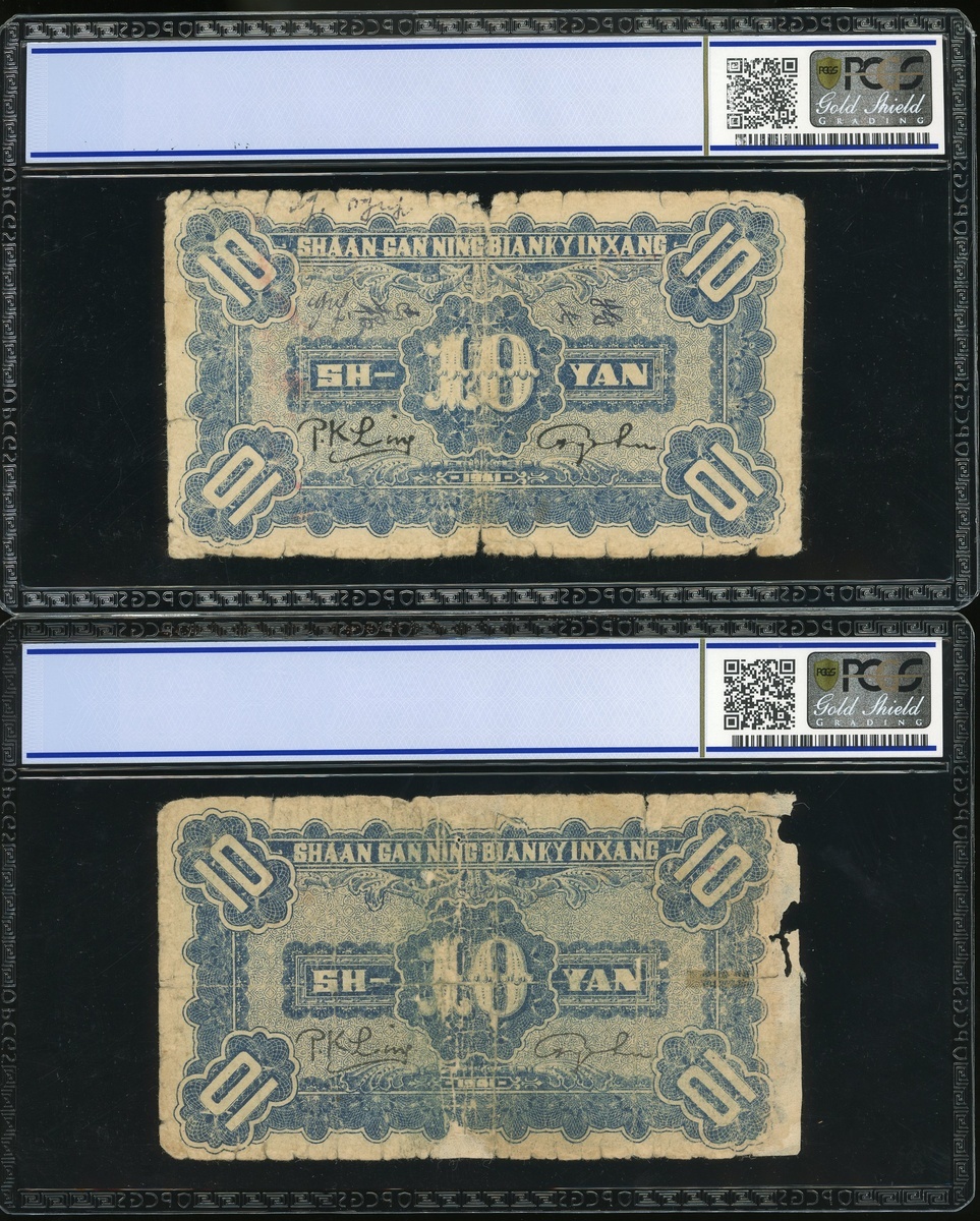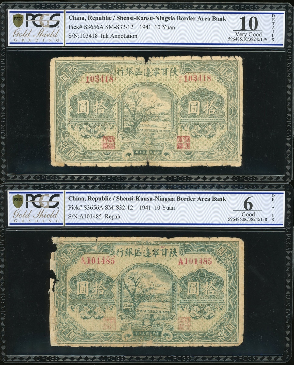 民國三十年陝甘寧邊區銀行拾圓一組兩枚,編號103418及A101485,PCGS Gold Shield 8 Details-10 Details,有修補及塗鴉