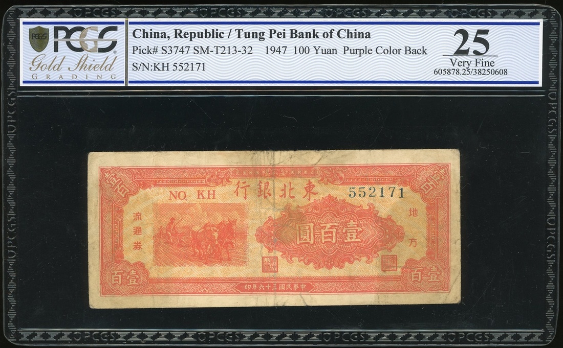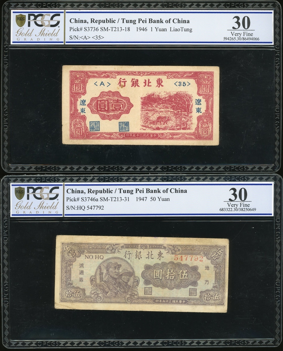 民國三十五及三十六年東北銀行壹、伍拾、壹佰圓一組三枚,PCGS Gold Shield 25-30