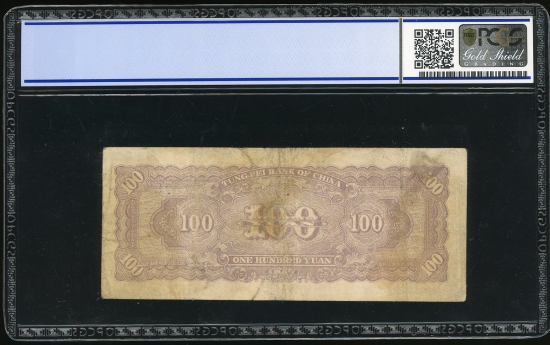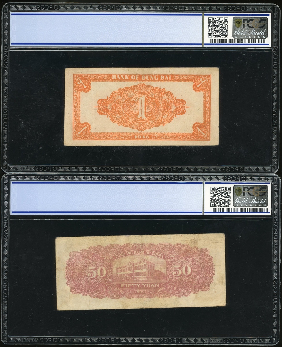 Tung Pei Bank of China, 1 Yuan, 1946, 50 and 100 Yuan, 1947, red, grey and orange respectively, (Pick S3736, S3746a, S3747), PCGS Gold Shield 25-30 Very Fine (3)