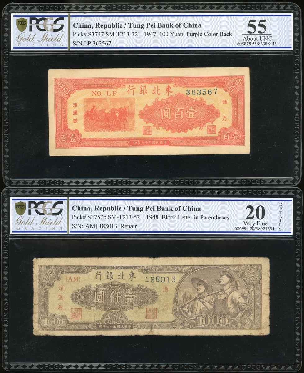 Tung Pei Bank of China, 100 Yuan, 1947 and 1000 Yuan, 1948, serial numbers LP363567 and AM188013, red and brown resepctively, (Pick S3747, S3757b), PCGS Gold Shield 20 DETAILS (Repair)-55 About Uncirculated (2)