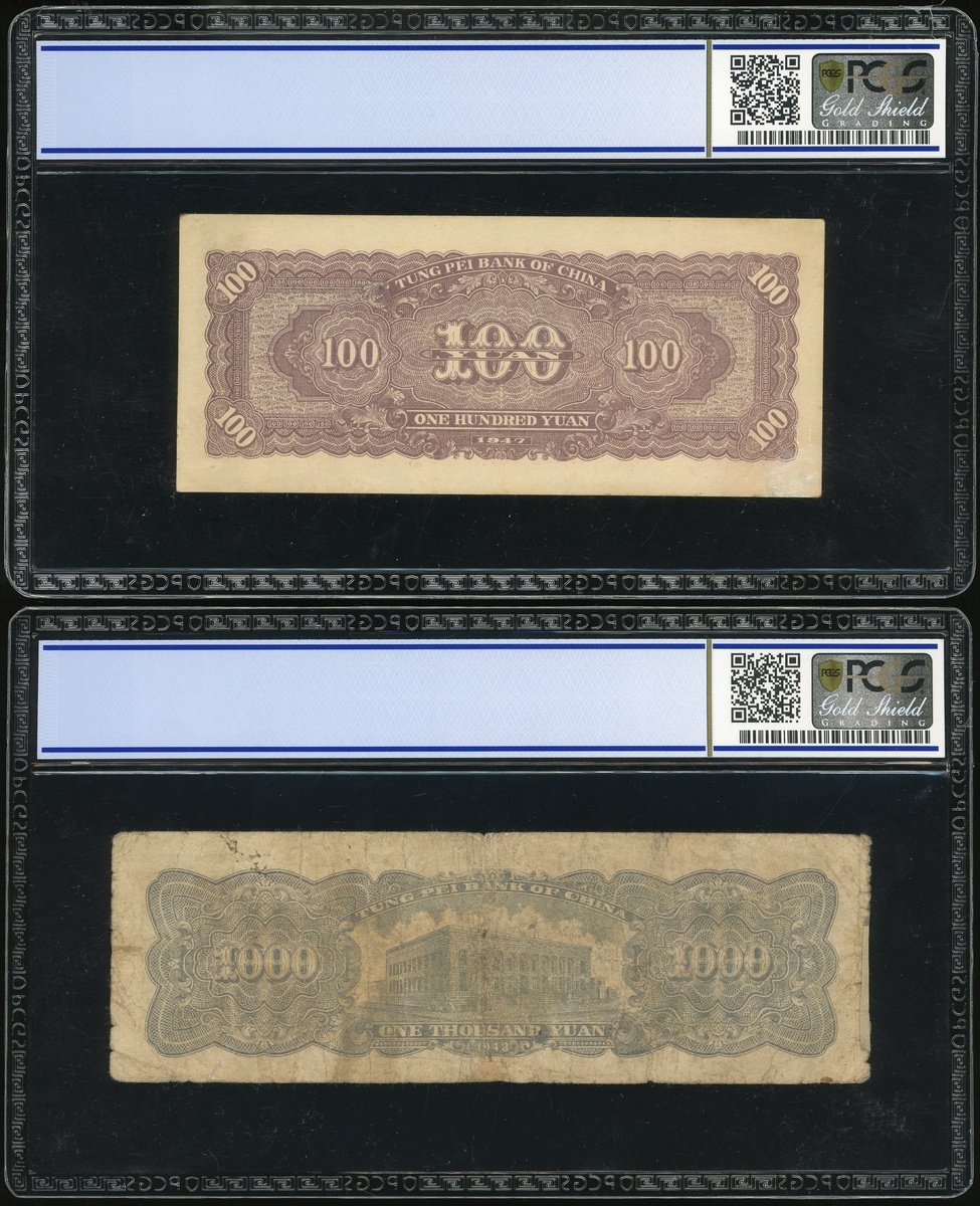 民國三十六及三十七年東北銀行壹佰、壹仟圓一組兩枚,編號LP363567及AM188013,PCGS Gold Shield 20 Details-55,第二枚有修補