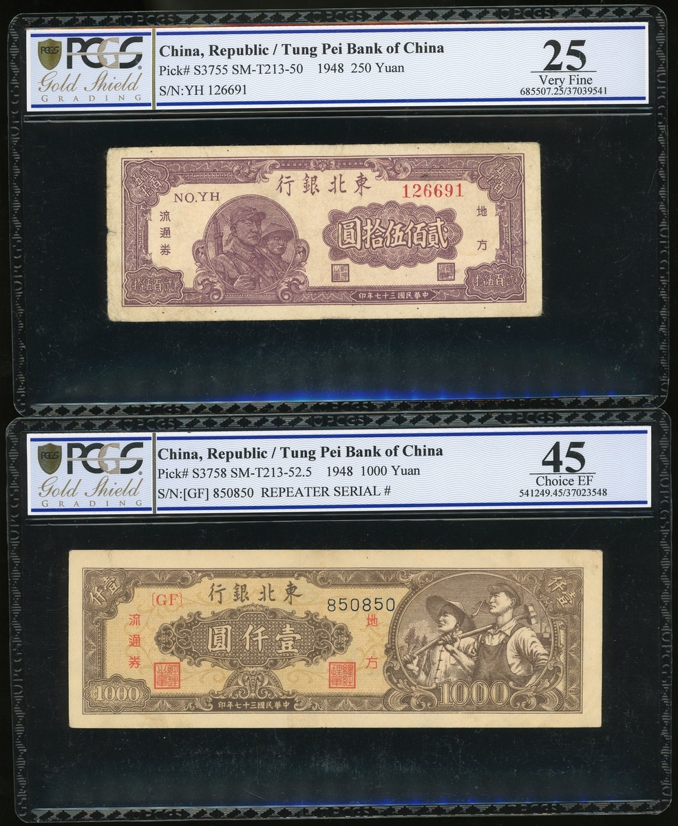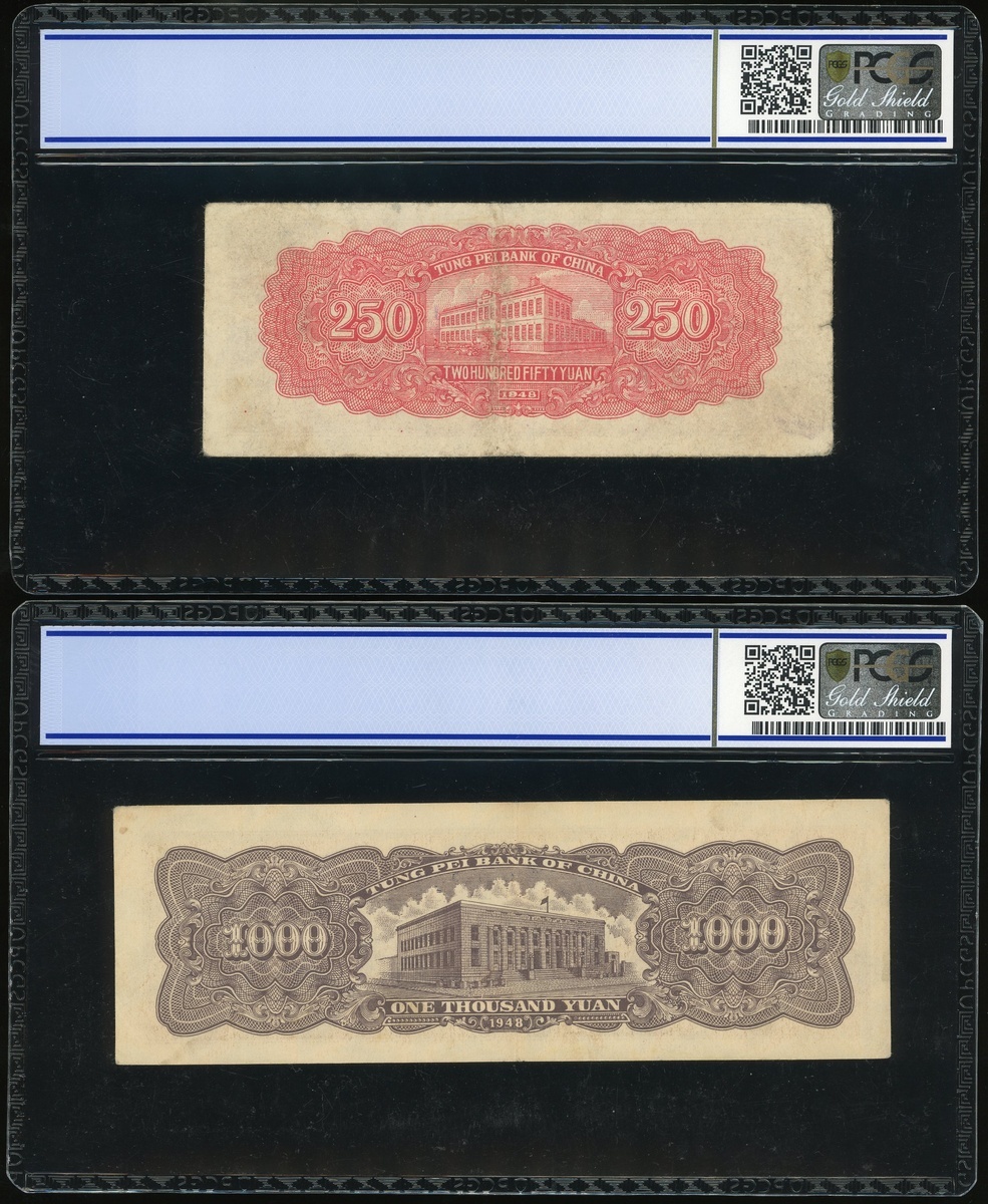 Tung Pei Bank of China, 250 and 1000 Yuan, 1948, serial numbers YH126691 and GD850850, dark purple and brown respectively, (Pick S3755, S3758), PCGS Gold Shield 25 Very Fine-45 Choice Extremely Fine (2)