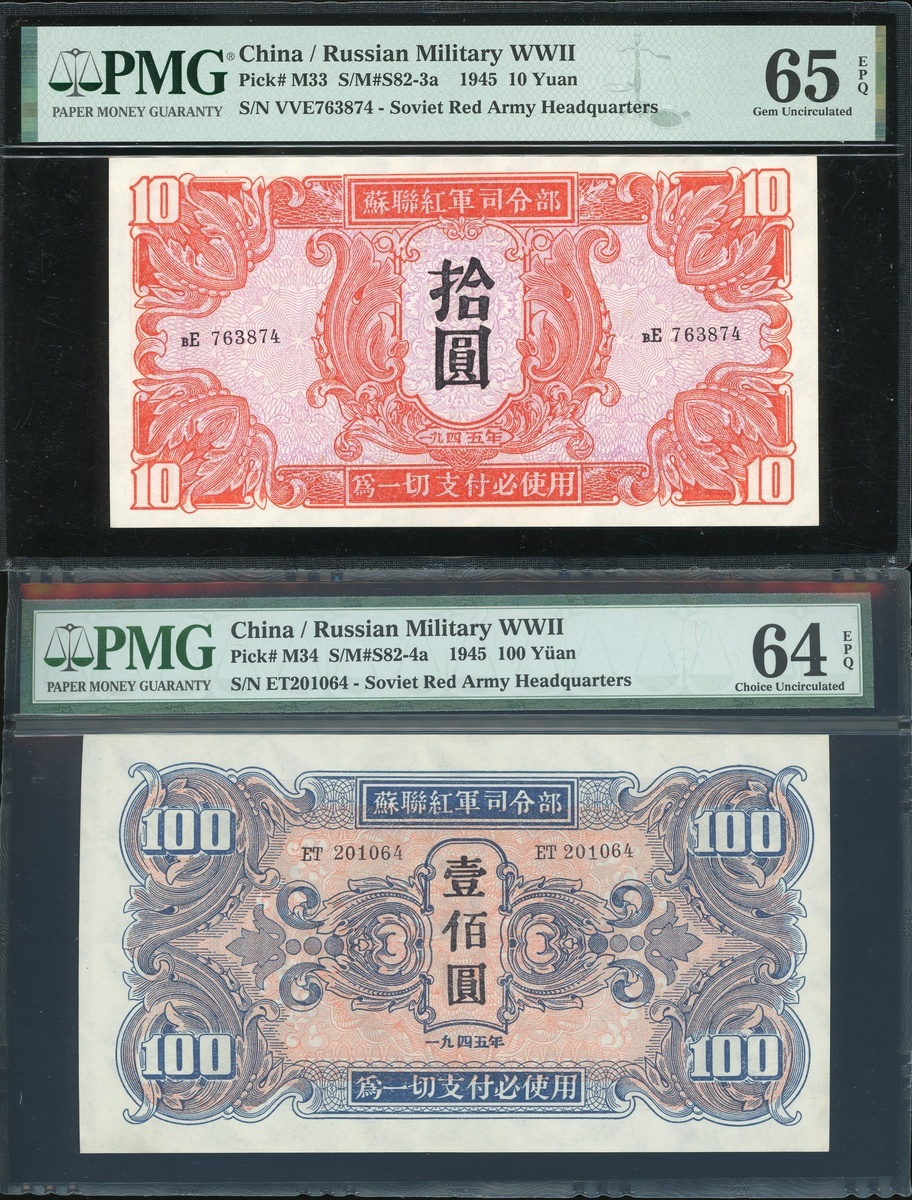 1945年蘇聯紅軍司令部拾、壹佰圓各一枚,編號VVE763874及ET201064,PMG 64EPQ-65EPQ