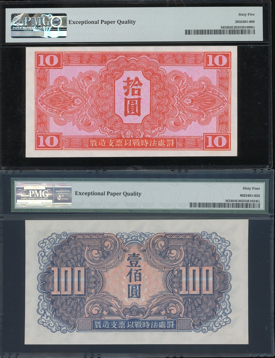 10 and 100 Yuan, 1945, serial numbers VVE763874 and ET201064, red and blue respectively,