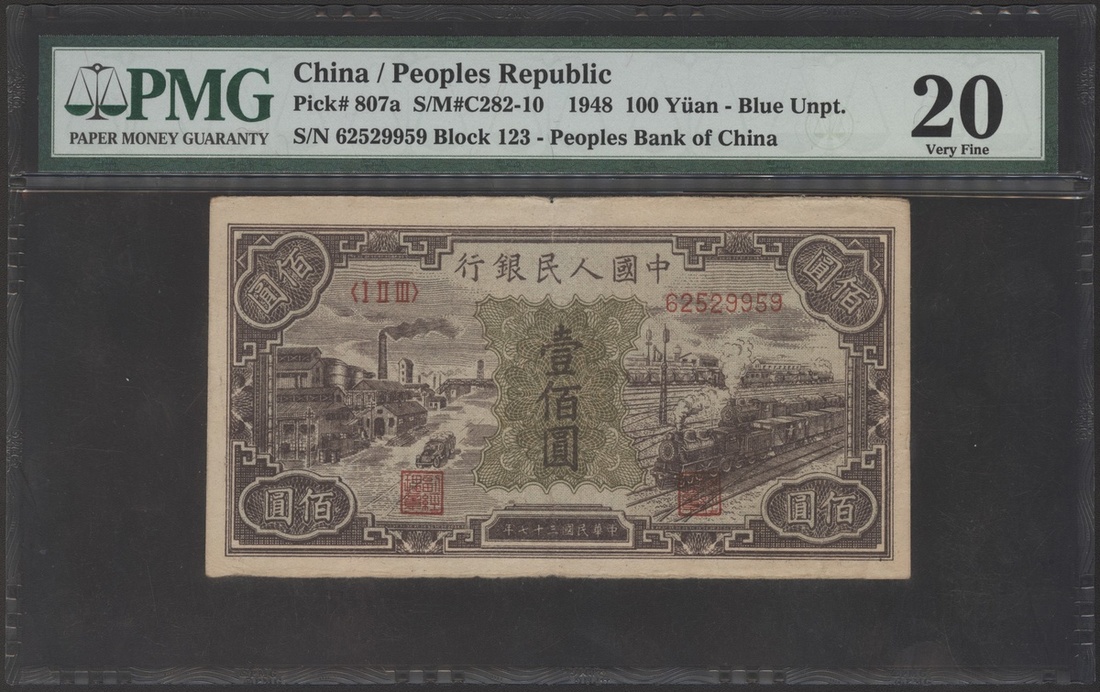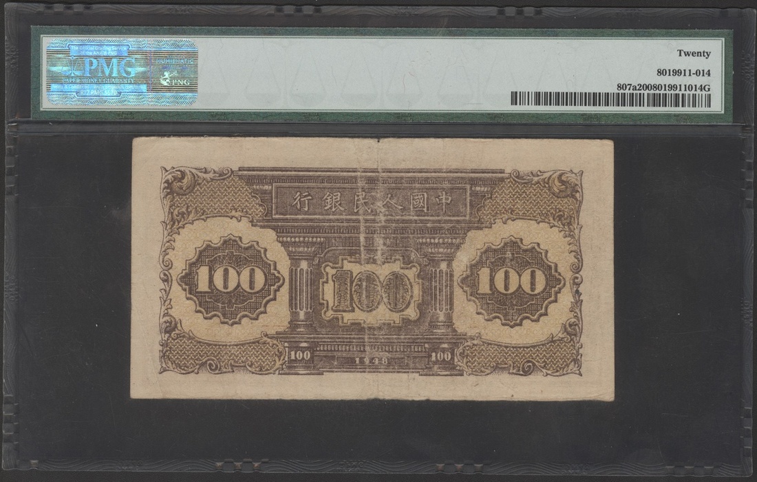 1948年中國人民銀行第一版人民幣100元「黑工廠」藍底,編號I II III 62529959,PMG 20