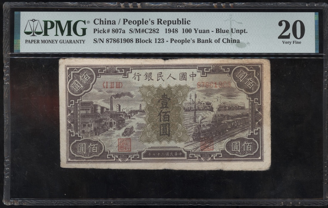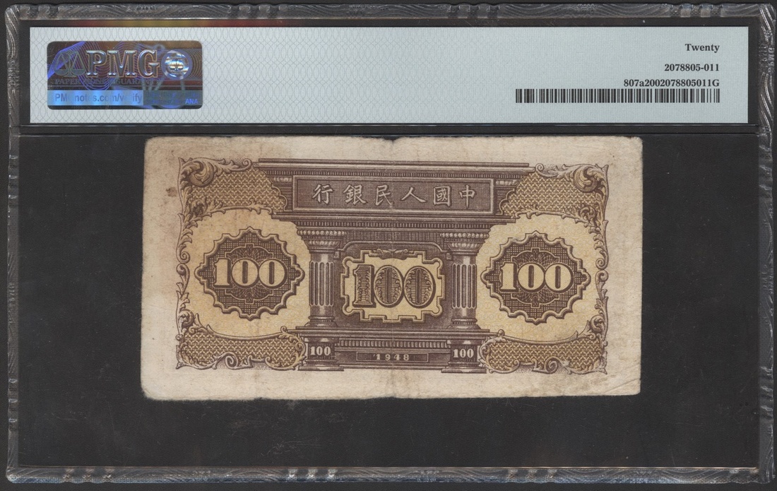 1948年中國人民銀行第一版人民幣100元「黑工廠」藍底,編號I II III 87861908,PMG 20