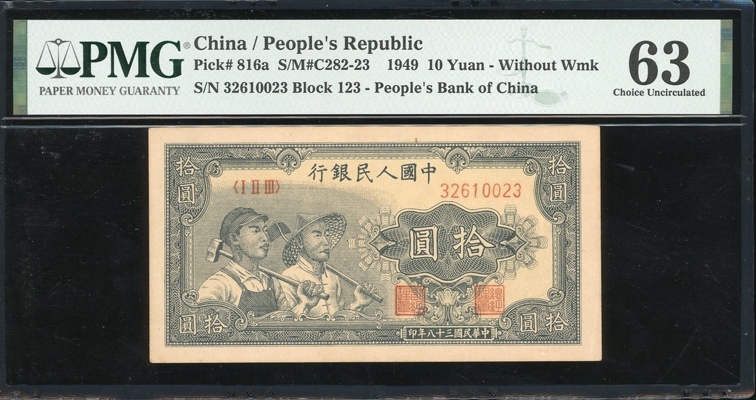1949年中國人民銀行第一版人民幣10元「工農」,編號I II III 32610023,PMG 63