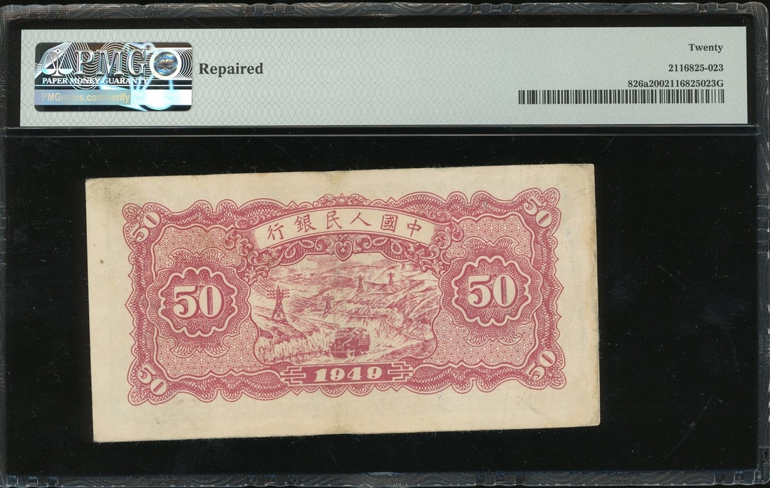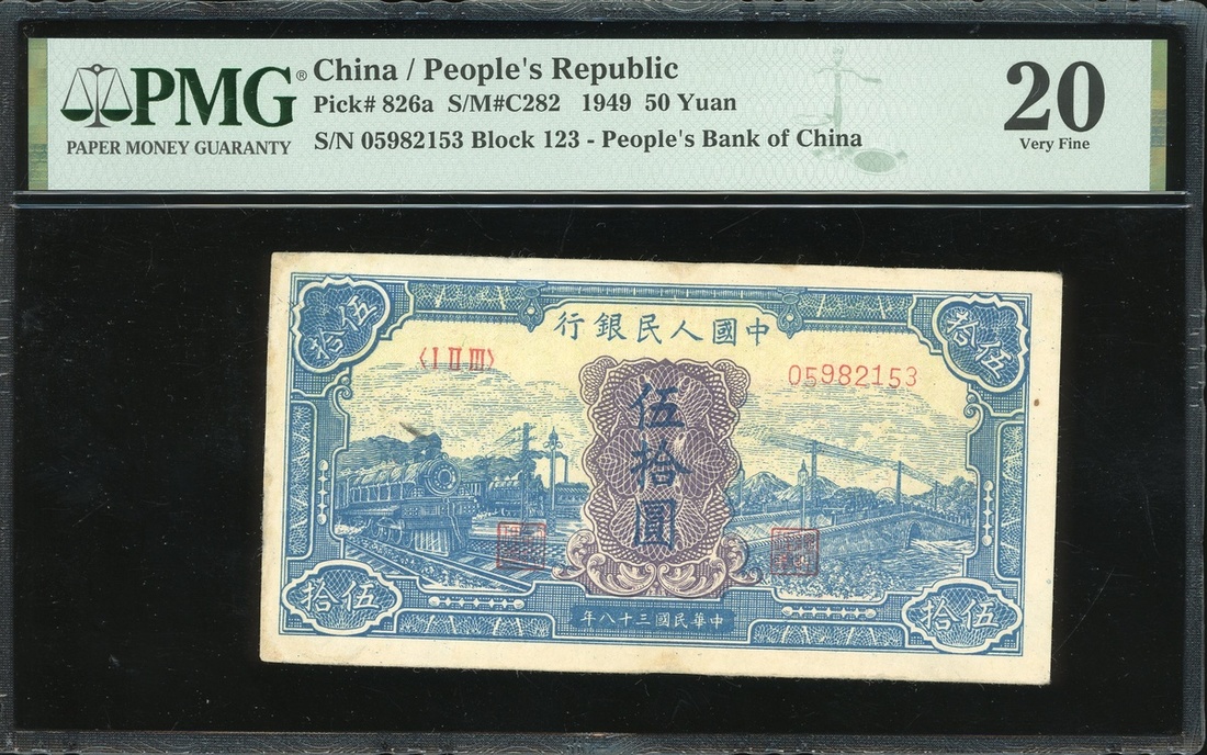 民國三十八年中國人民銀行伍拾圓「藍火車」,編號 I II III 05982153, PMG 20,有修補