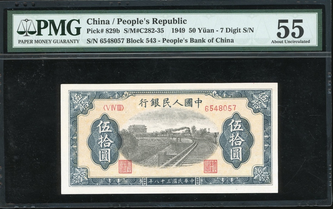 1949年中國人民銀行第一版人民幣50元「火車」,編號V IV III 6548057,PMG 55