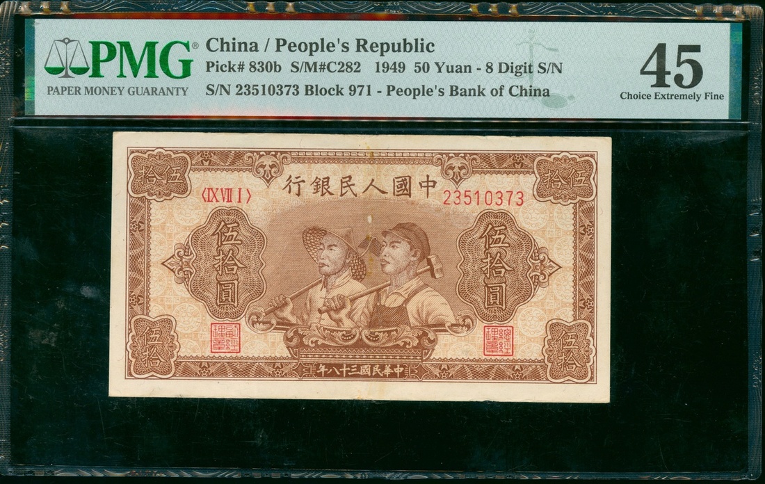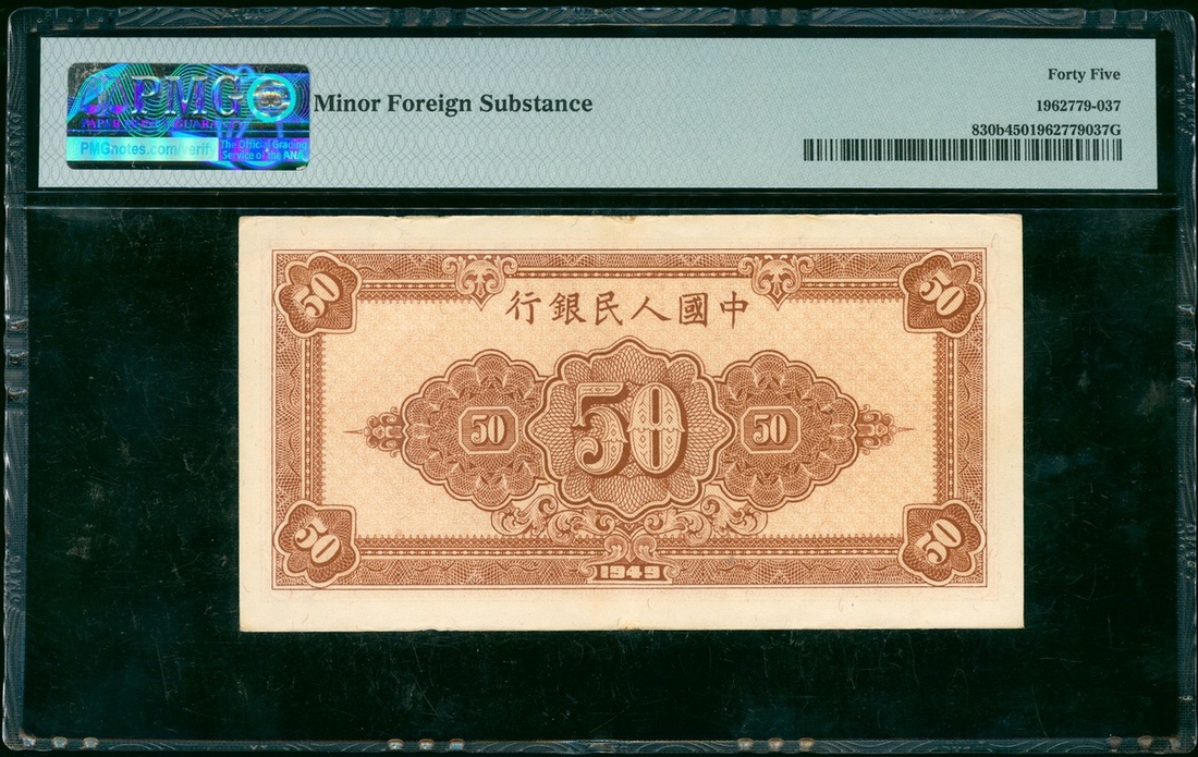 1949年中國人民銀行第一版人民幣50元「工農」,編號IX VII I 23510373,PCGS 45,有少量附著物