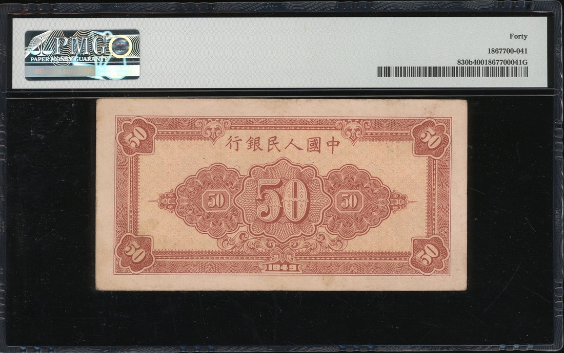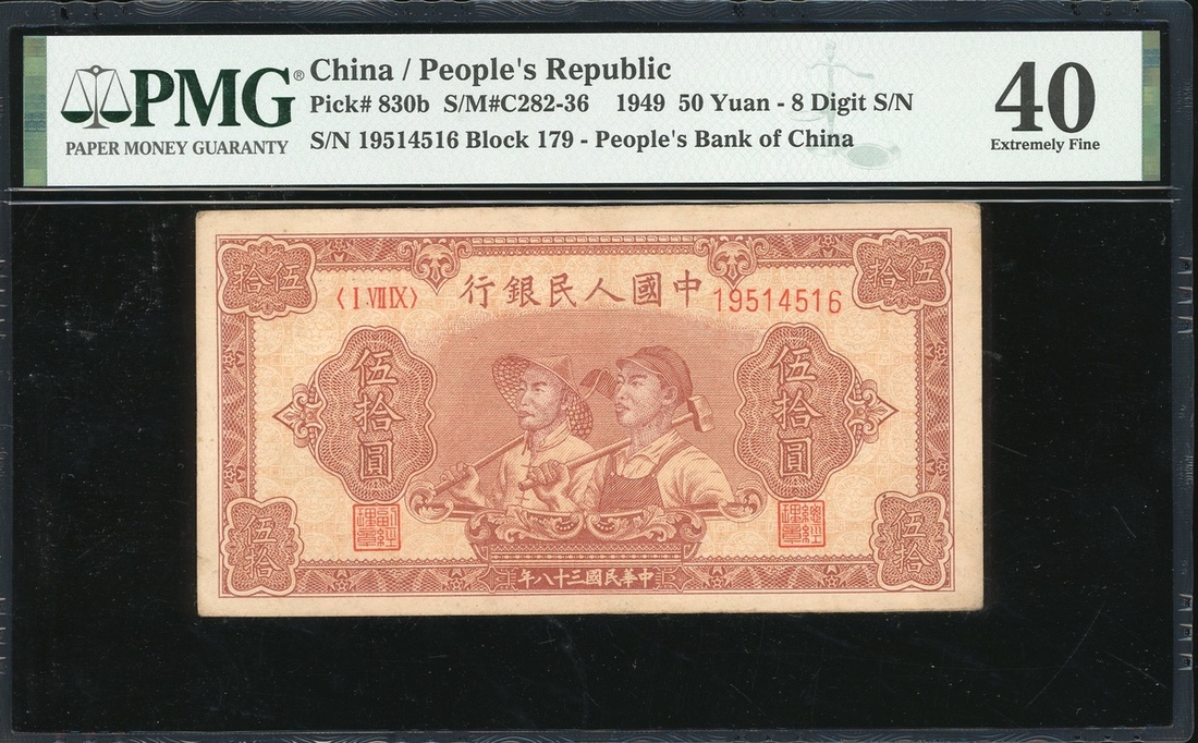 1949年中國人民銀行第一版人民幣50元「工農」,編號I VII IX 19514516,PMG 40