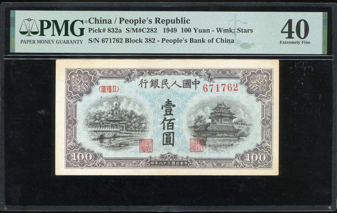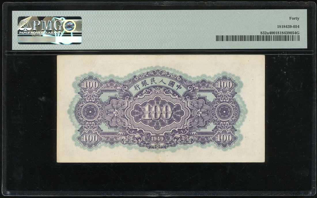 1949年中國人民銀行第一版人民幣100元「藍北海橋」,編號X II VIII 83547270,PMG 40,顏色鮮明亮麗