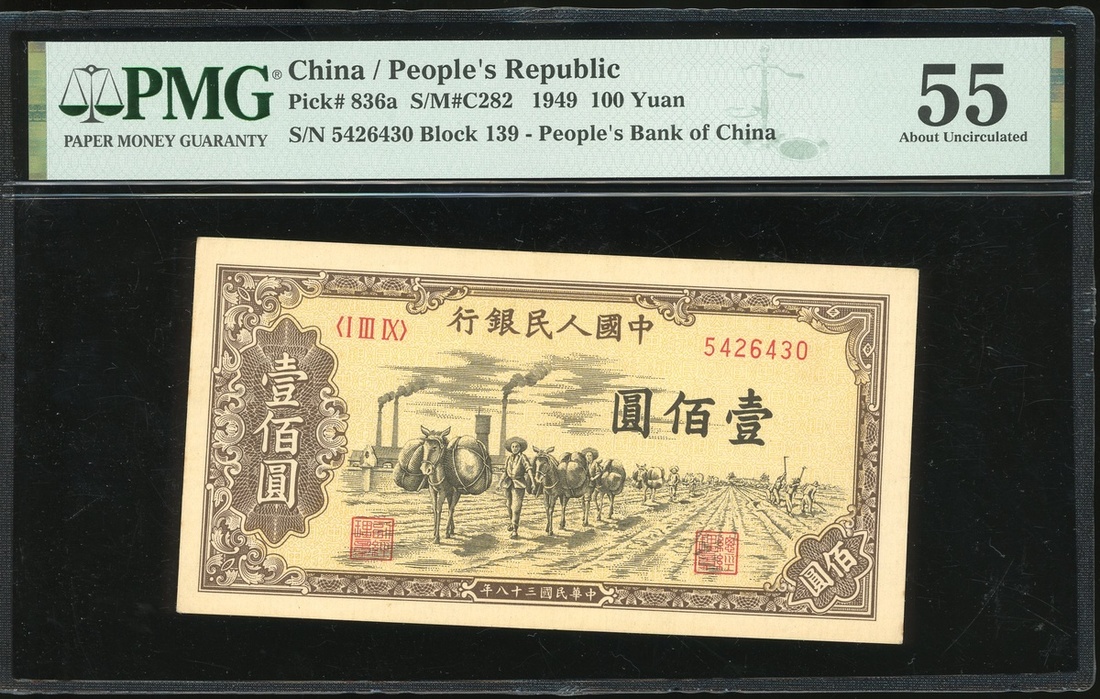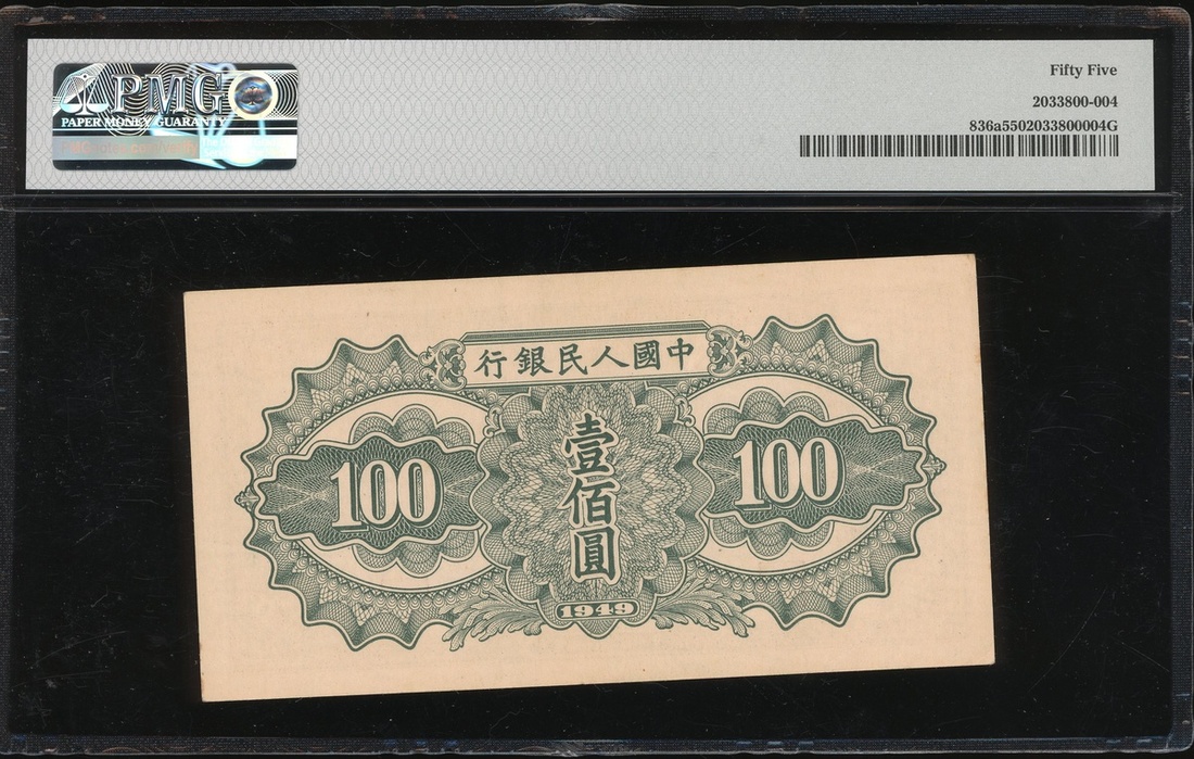 1949年中國人民銀行第一版人民幣100元「驢運」,編號I III IX 5426430,PMG 55