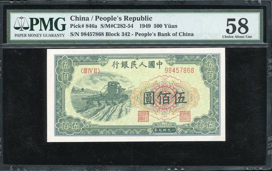 1949年中國人民銀行第一版人民幣500元「拖拉機」,編號III IV II 98457868,PMG 58