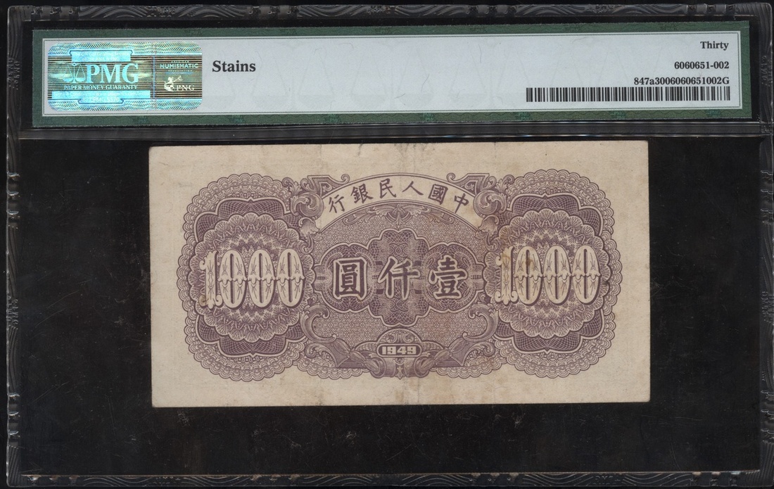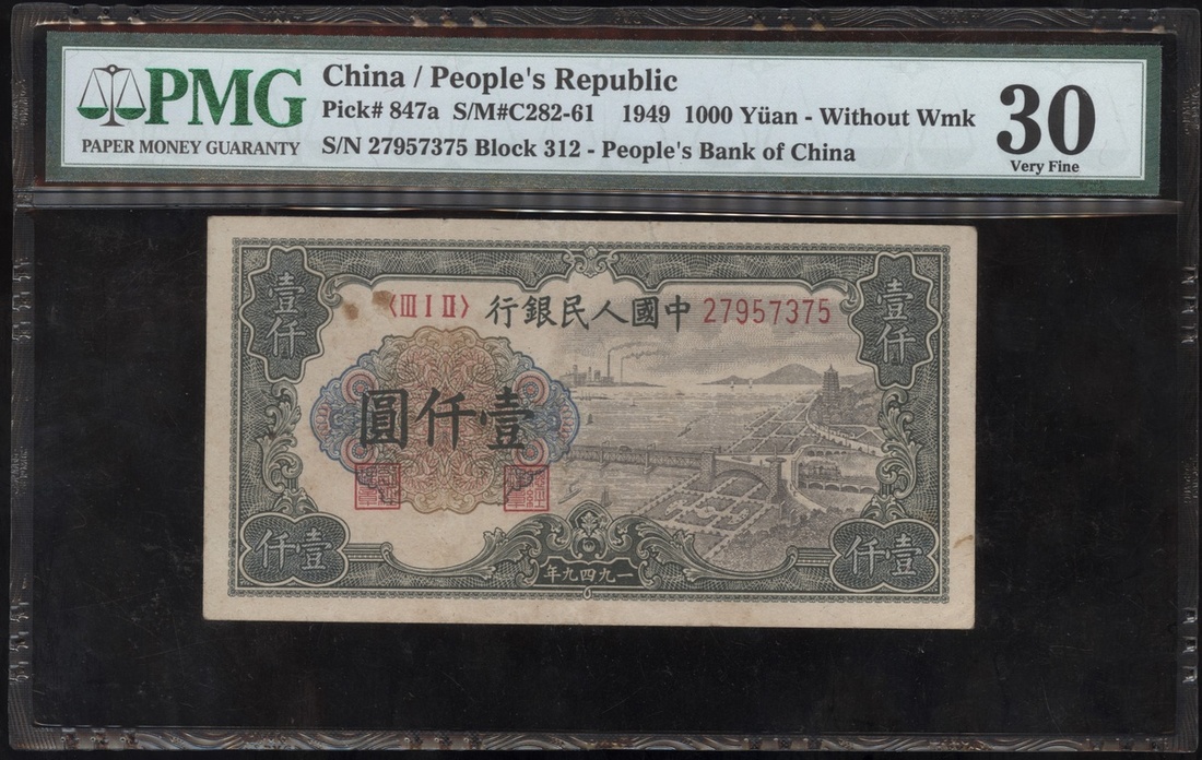 1949年中國人民銀行第一版人民幣1000元「錢塘江橋」,編號III I II 27957375,PMG 30,有漬