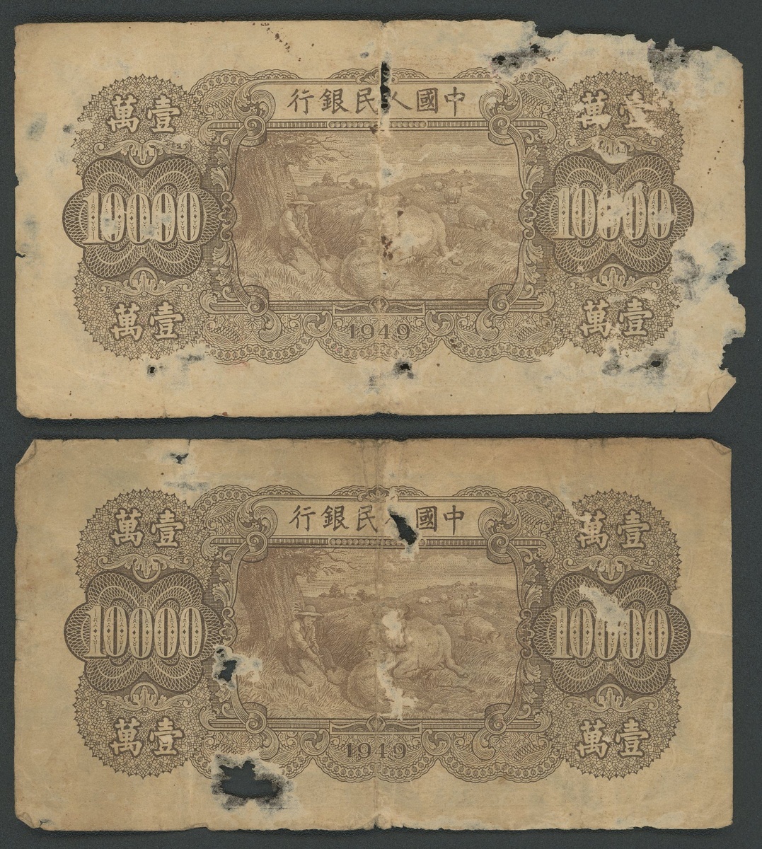 1949年中國人民銀行第一版人民幣10000元「雙馬耕地」,編號I III II 74240079及II I III 10016047,G品相,有孔,邊角撕裂
