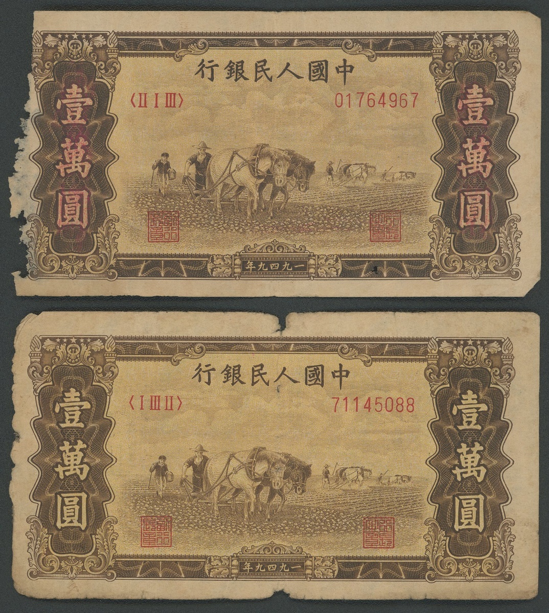 1949年中國人民銀行第一版人民幣10000元「雙馬耕地」,編號II I III 01764967及I III II 71145088,G品相,有孔,邊角撕裂