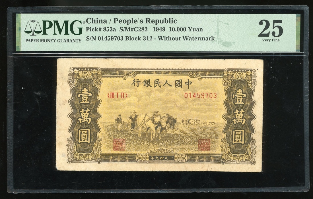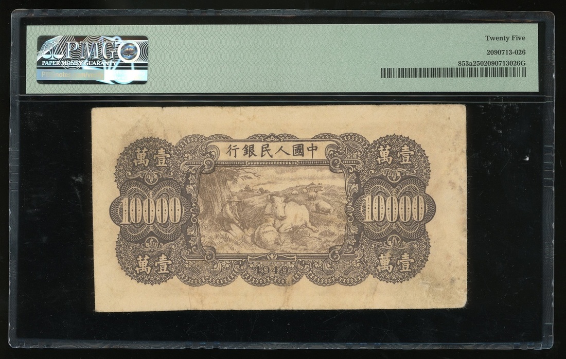 1949年中國人民銀行第一版人民幣10000元「雙馬耕地」,編號III I II 01459703,PMG 25
