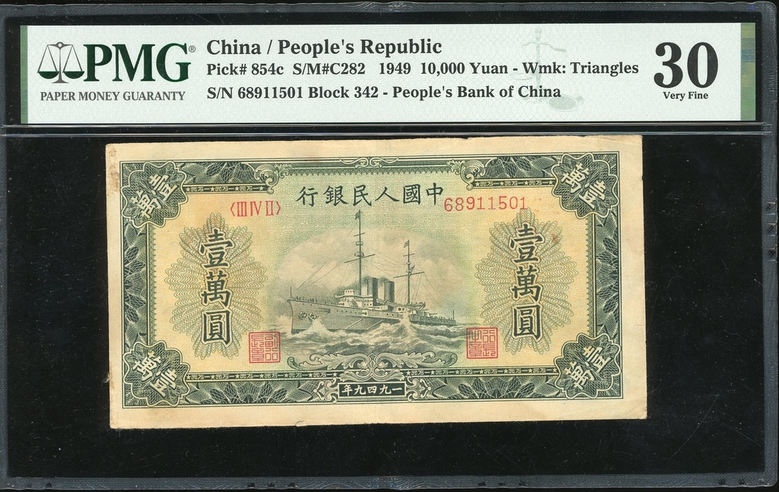 People's Bank of China, 1st series renminbi, 1949, 10,000 yuan, Warship, triangular watermark, serial number III IV II 68911501,