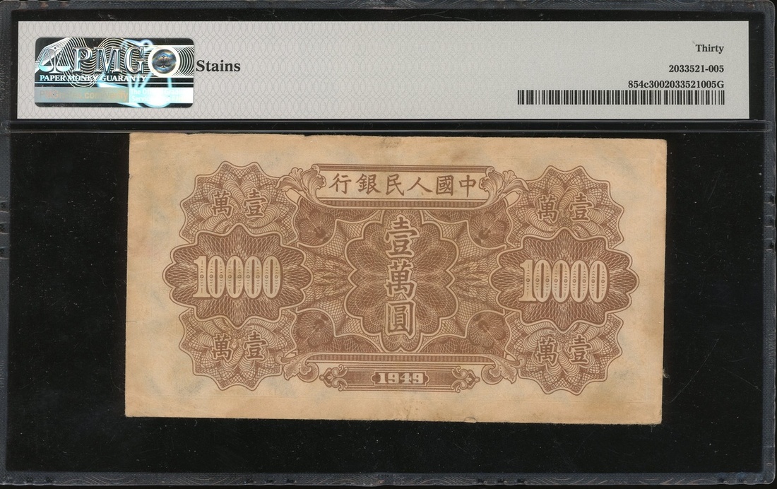 1949年中國人民銀行第一版人民幣10000元「軍艦」,編號III I II 01459703,菱角水印,PMG 30,有漬