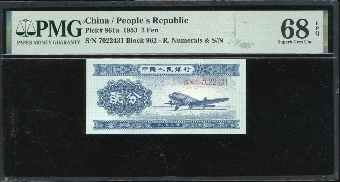 People's Bank of China, 2 Fen, 1953, serial number IX VI II 7022431, blue, airplane at right, (Pick 861a), PMG 68EPQ Superb Gem Uncirculated