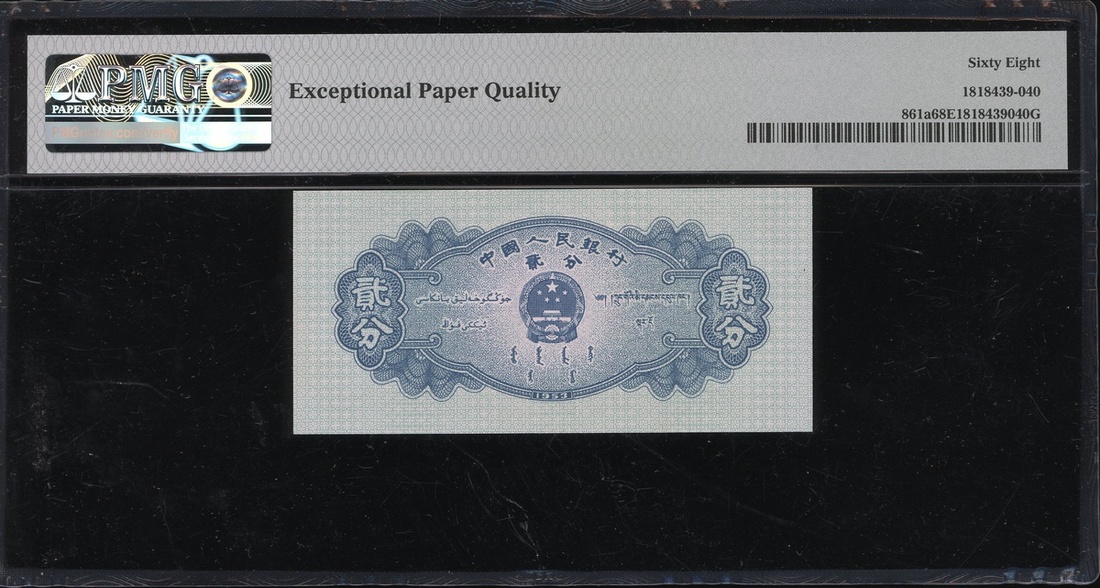 1953年中國人民銀行貳分,編號IX VI II 7022431,PMG 68EPQ