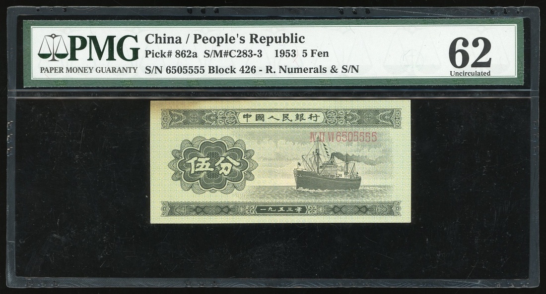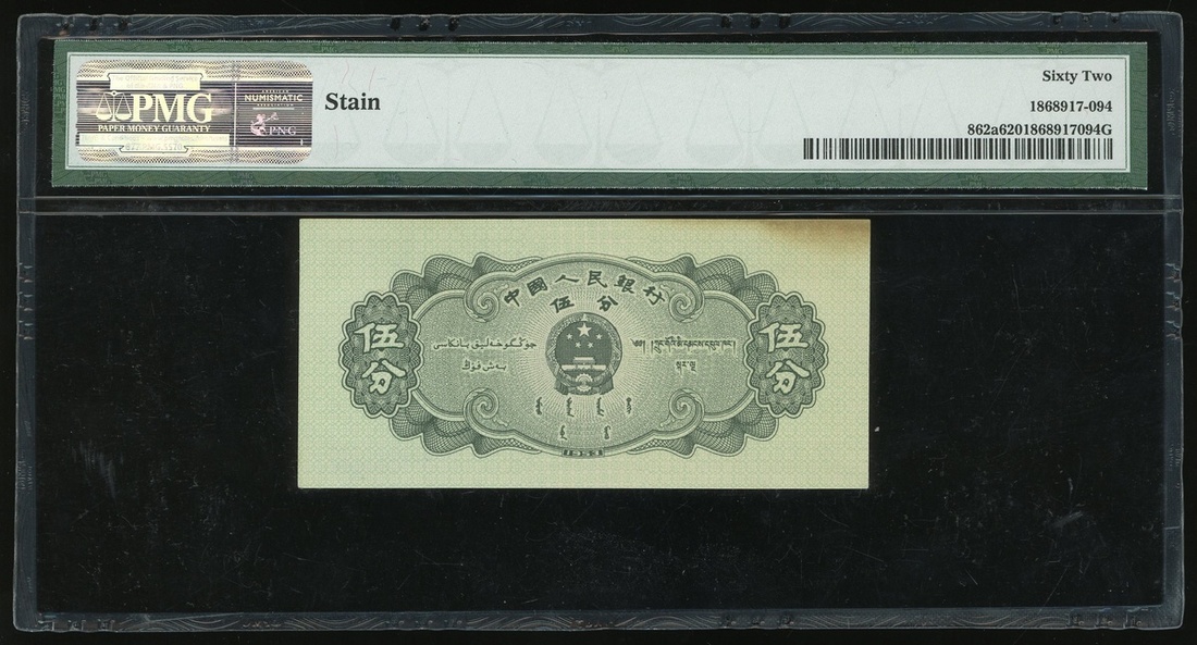 1953年中國人民銀行伍分,編號IV II VI 6505555,PMG 62,有污漬