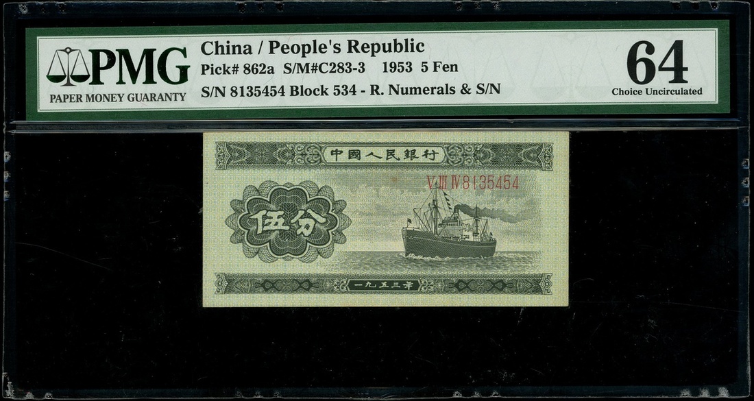 1953年中國人民銀行第二版人民幣5分,編號V III IV 8135454,PMG 64