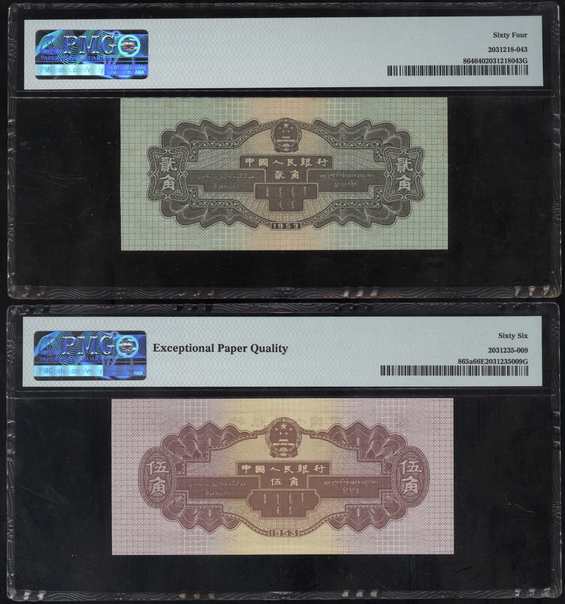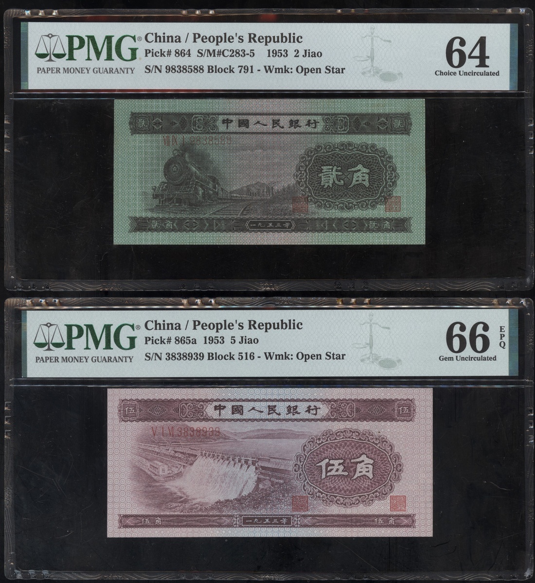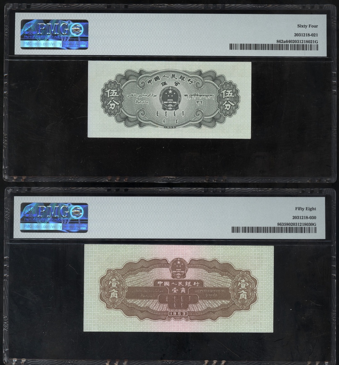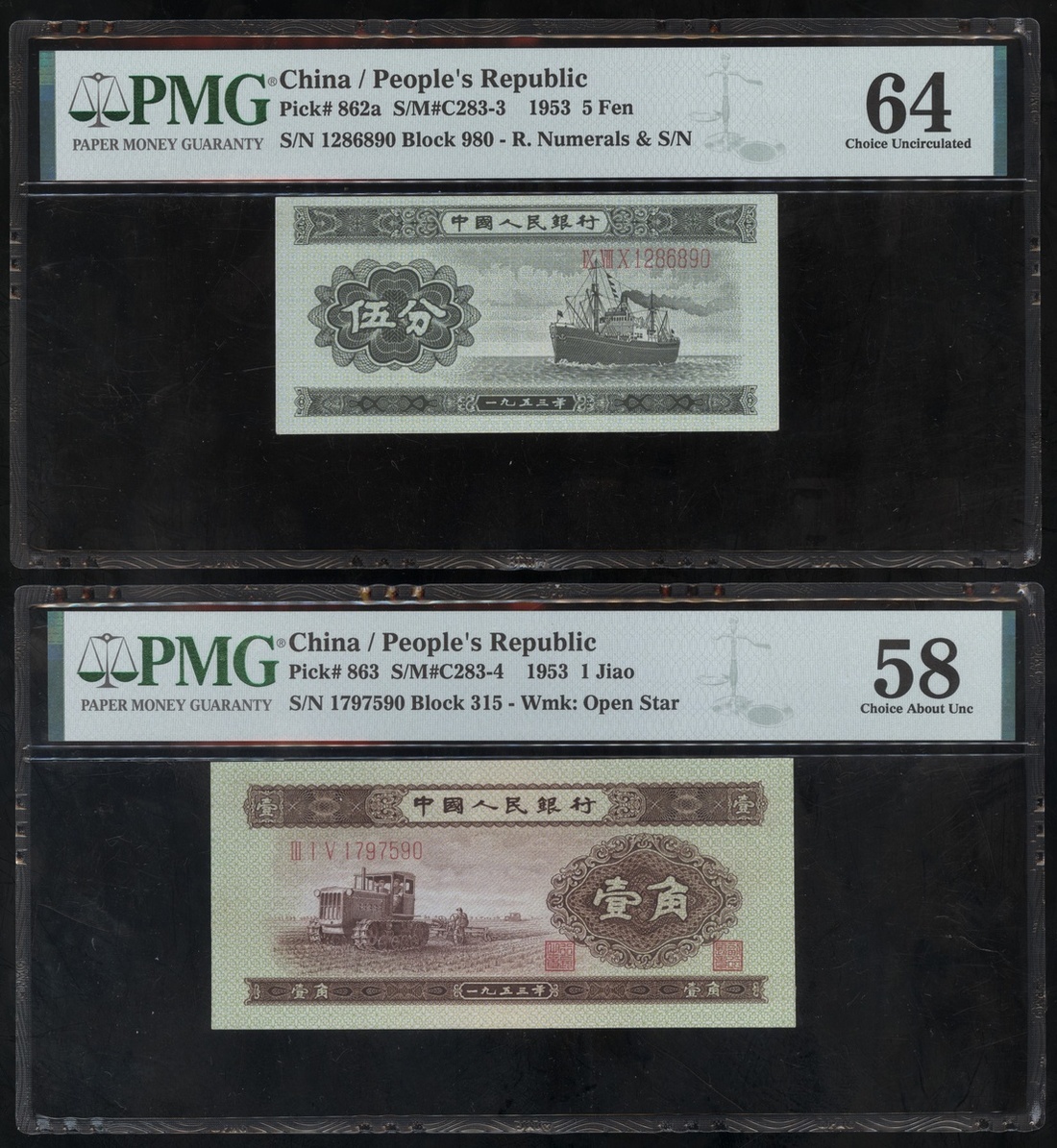 People's Bank of China, a group of 4 notes, consists of 5 Fen, 1 Jiao, 2 Jiao and 5 Jiao, 1953, serial numbers IX VIII X 1286890, III I V 1797590, VIII IX I 9838588 and V I VI 3838939, (Pick 862a, 863, 864, 865a), graded PMG 64, 58, 64 and 6966EPQ respectively (4)