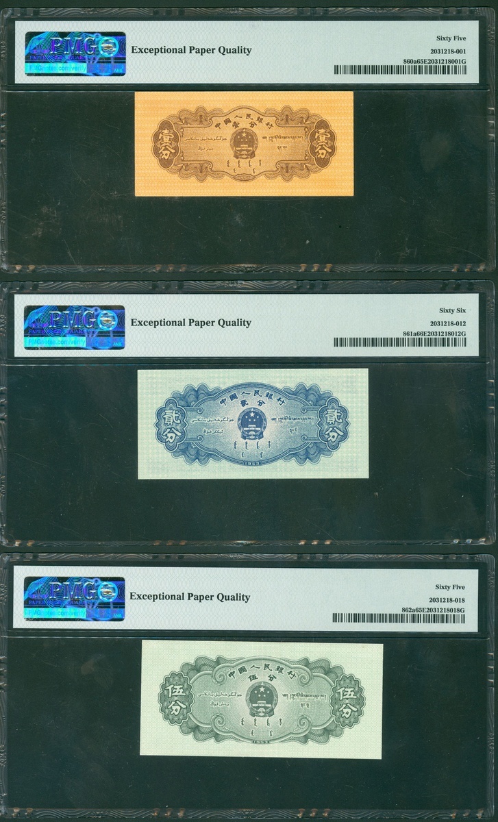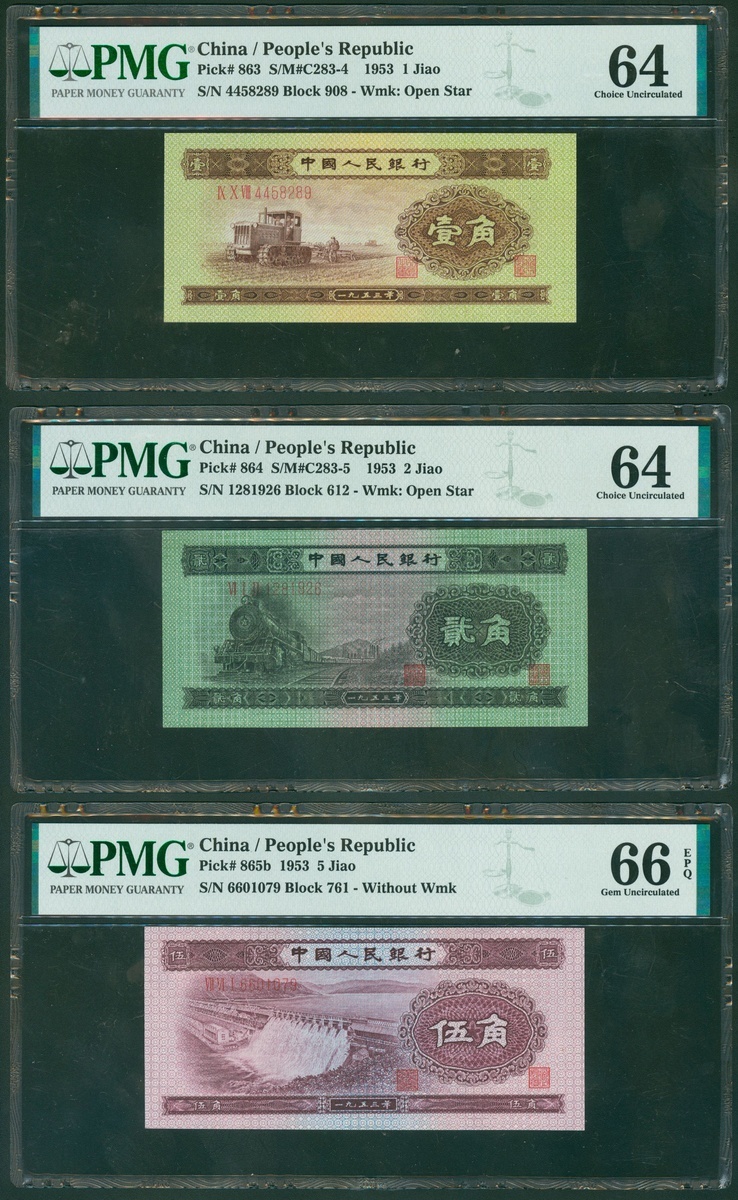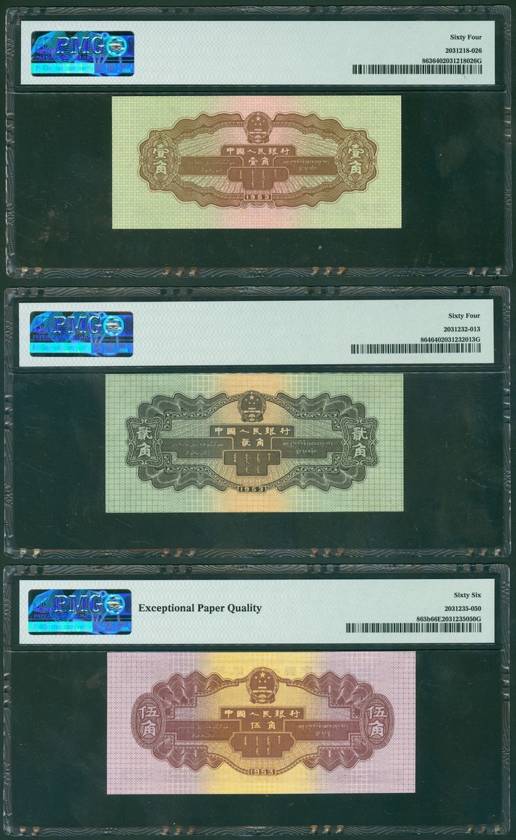 1953年中國人民銀行第二版人民幣一組3枚,1, 2及5角,編號IX X VIII 4458289, VI I II 1281926 及 II VI IV 2202874,1角及2角有星水印,分別評PMG 64, 64 及 66EPQ