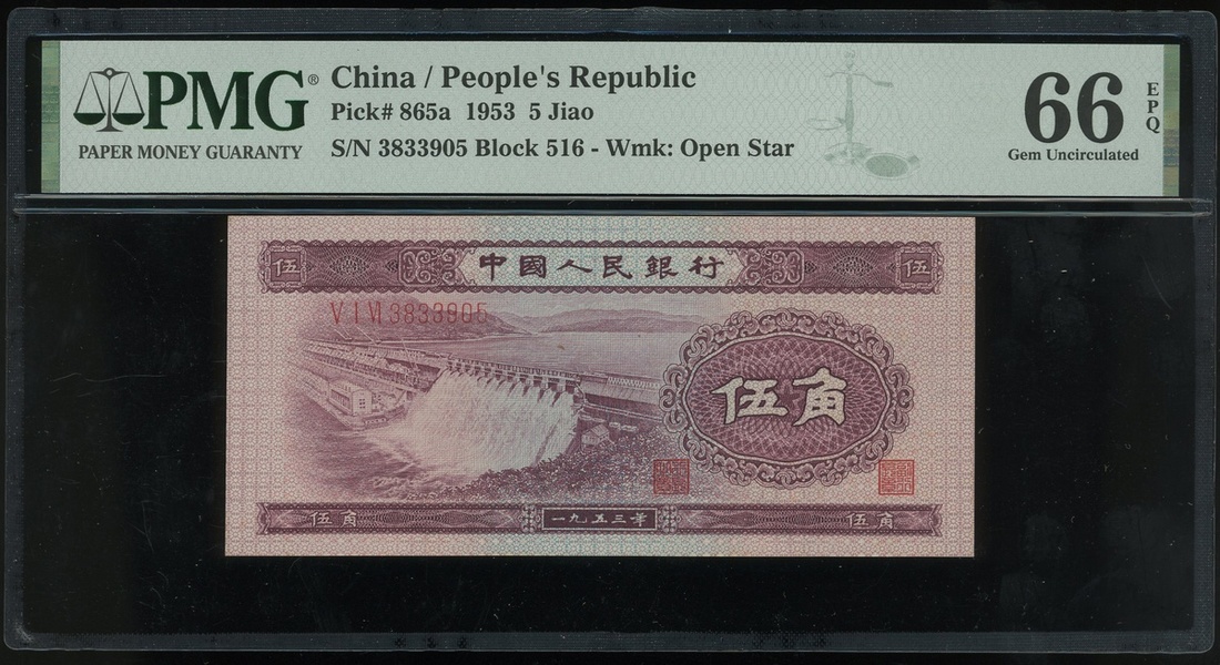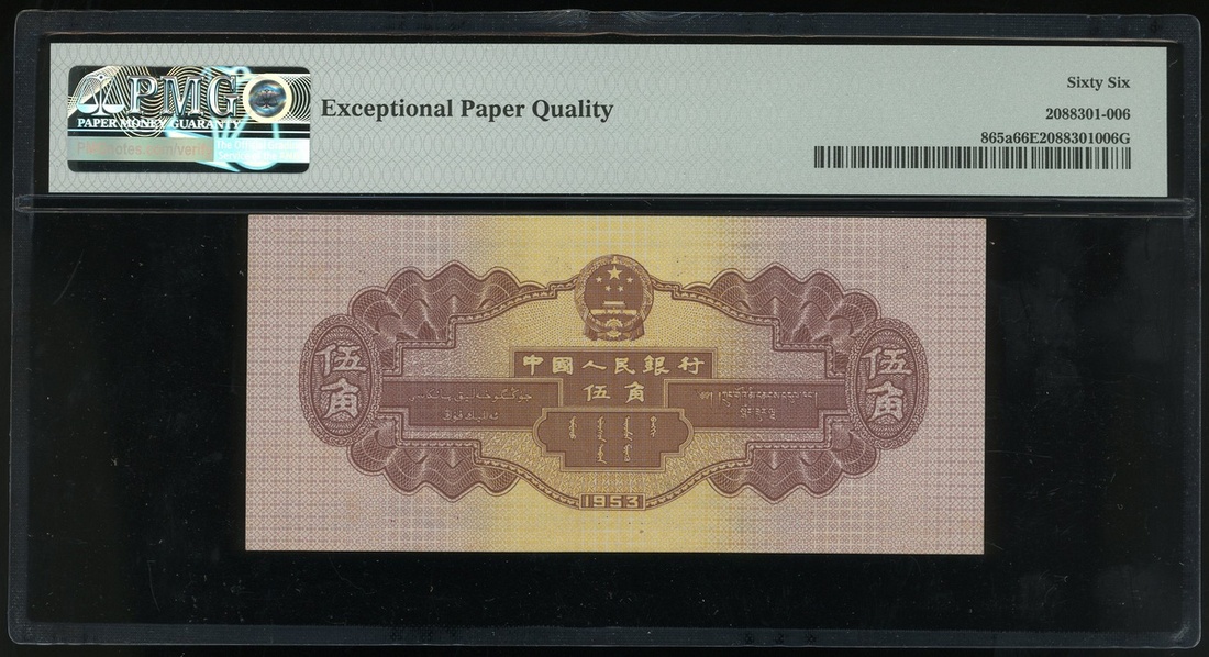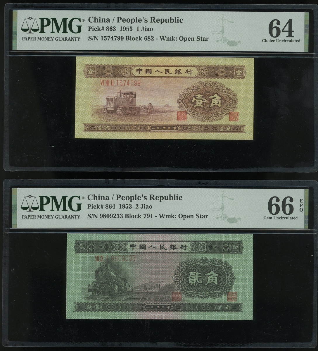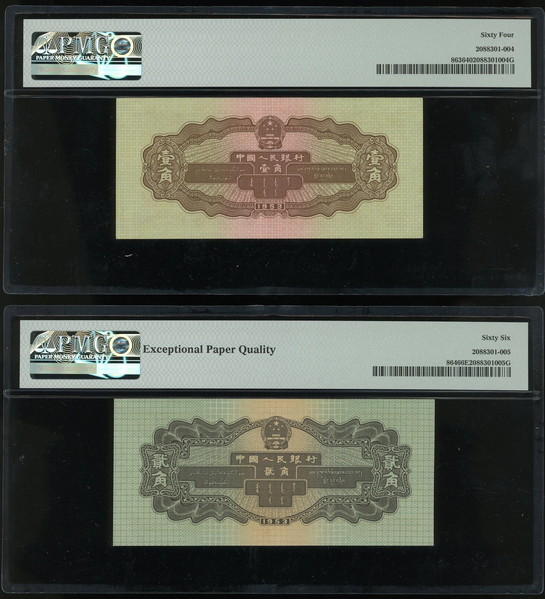 1953年中國人民銀行第二版人民幣一組3枚,1, 2及5角,編號IX X VIII 2316968, VII I IX 8836691 及 I VI VIII 3477420,5角有星水印,分別評PMG 64, 65EPQ 及 66EPQ