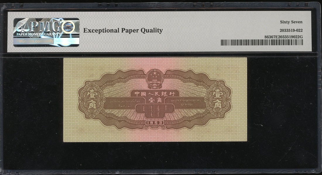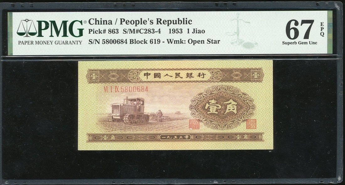 1953年中國人民銀行第二版人民幣1角,編號VI I IX 5800684,有星水印,PMG 67EPQ