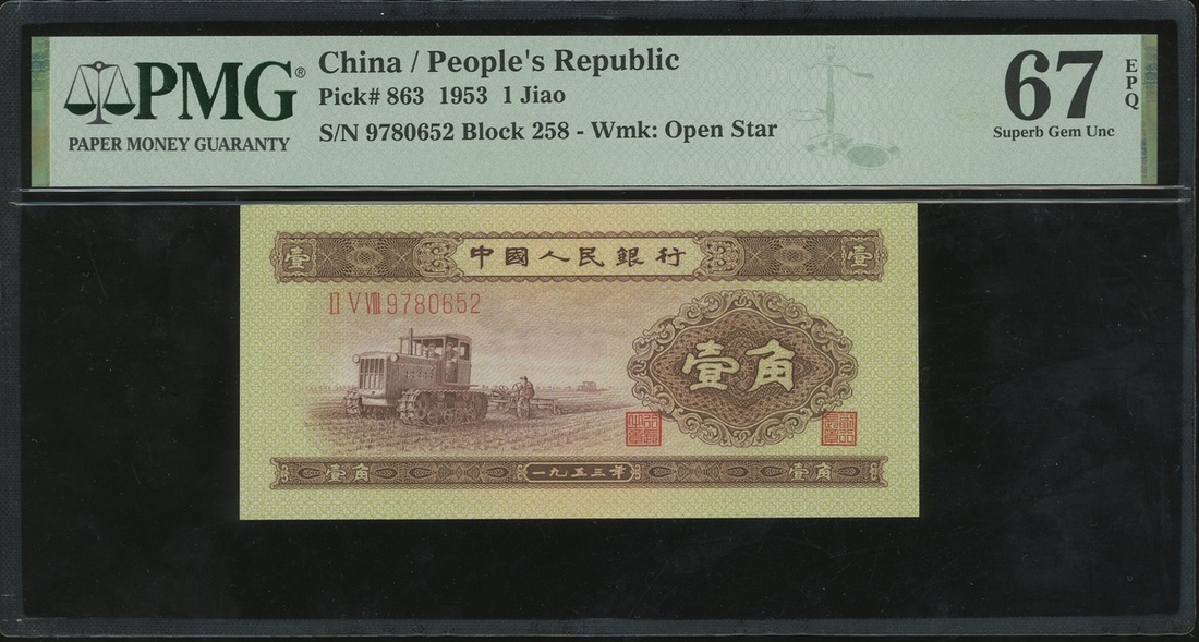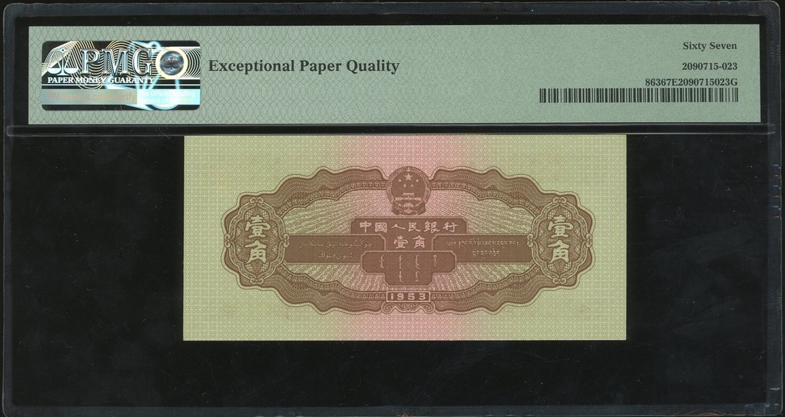 1953年中國人民銀行第二版人民幣1角,編號II V VIII 9780652,PMG 67EPQ