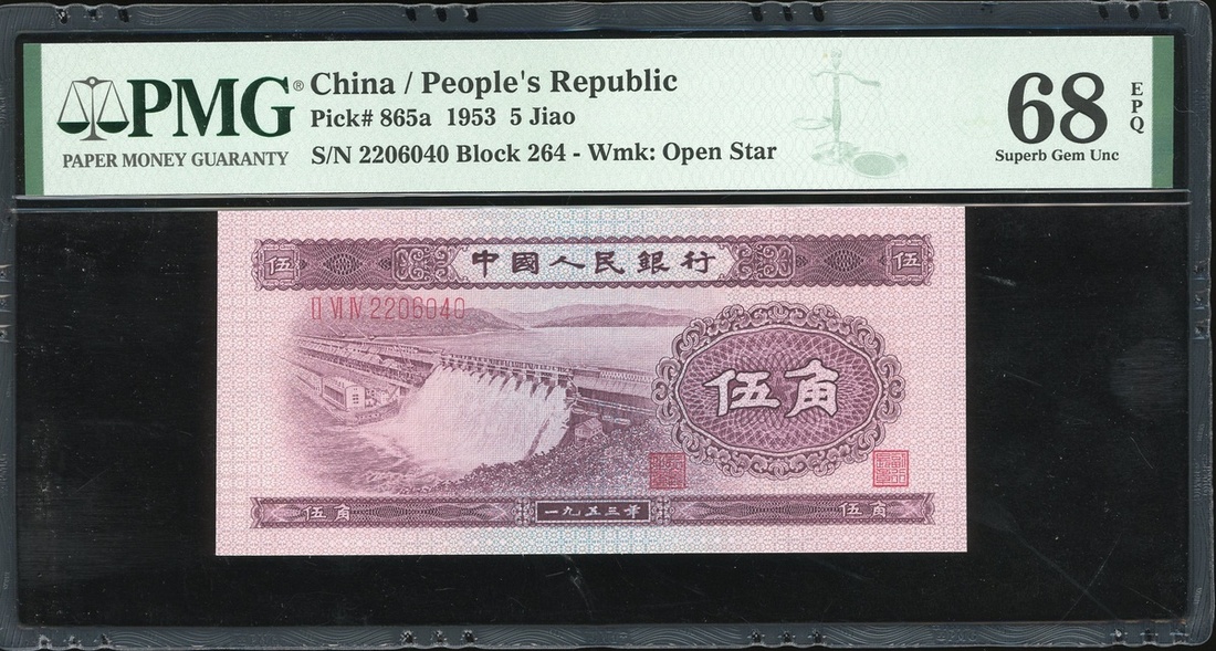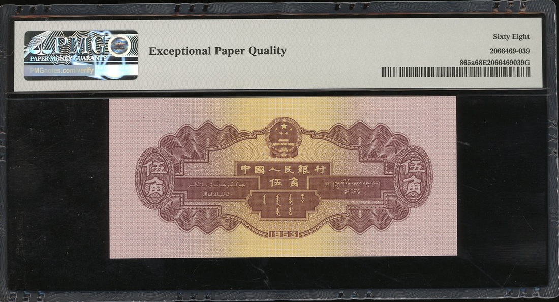 1953年中國人民銀行第二版人民幣5角,編號II VI IV 2206040,PMG 68EPQ