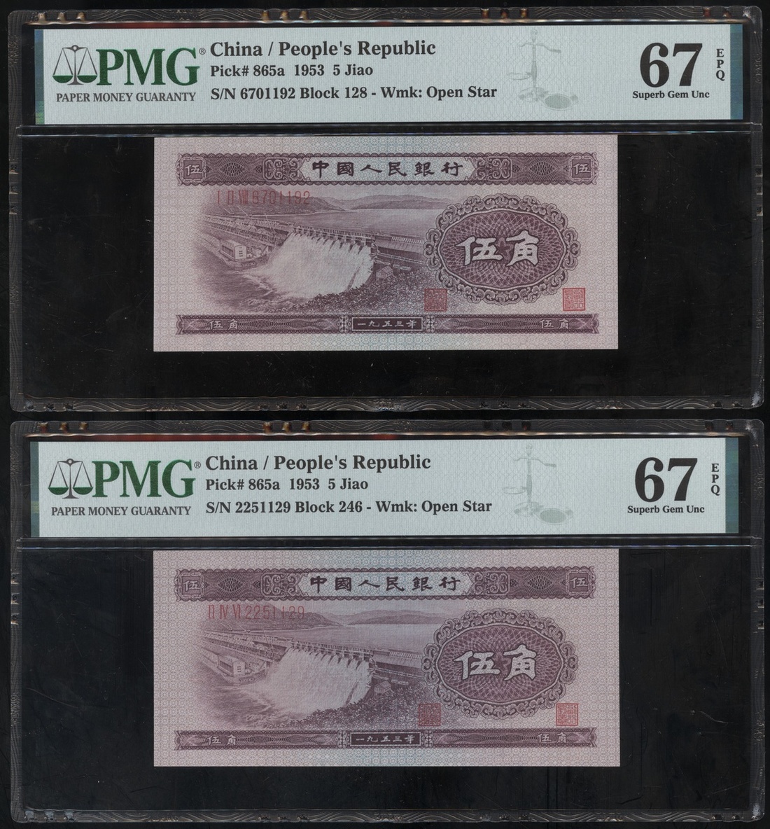 People's Bank of China, 5 Jiao, 1953, serial numbers I II VIII 6701192 and II IV VI 2251129, purple, river dam at centre, (Pick 865a), PMG 67EPQ Superb Gem Uncirculated (2)
