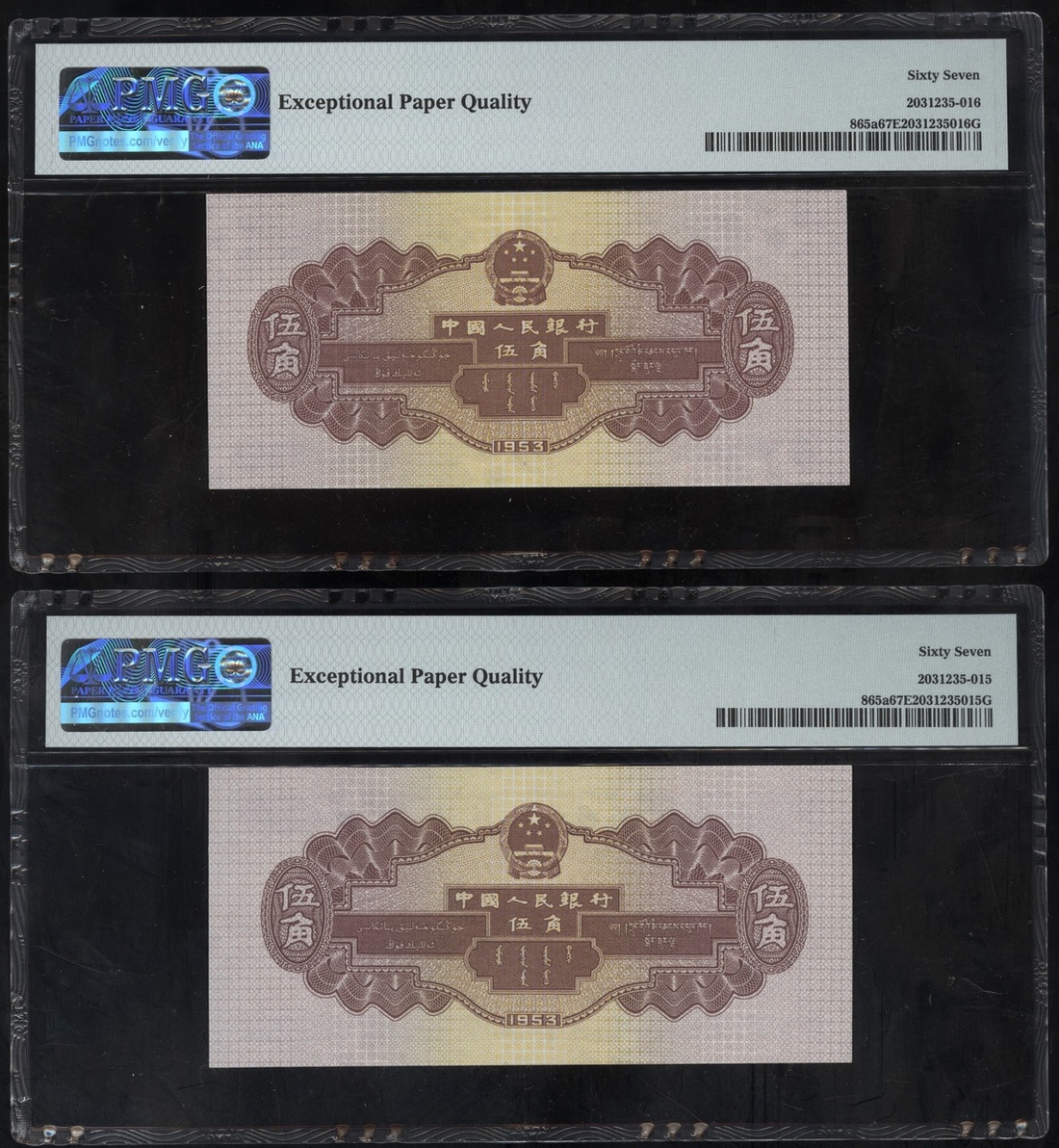 1953年中國人民銀行伍角一組兩枚,編號I II VIII 6701192及II IV VI 2251129,星水印版,均PMG 67EPQ