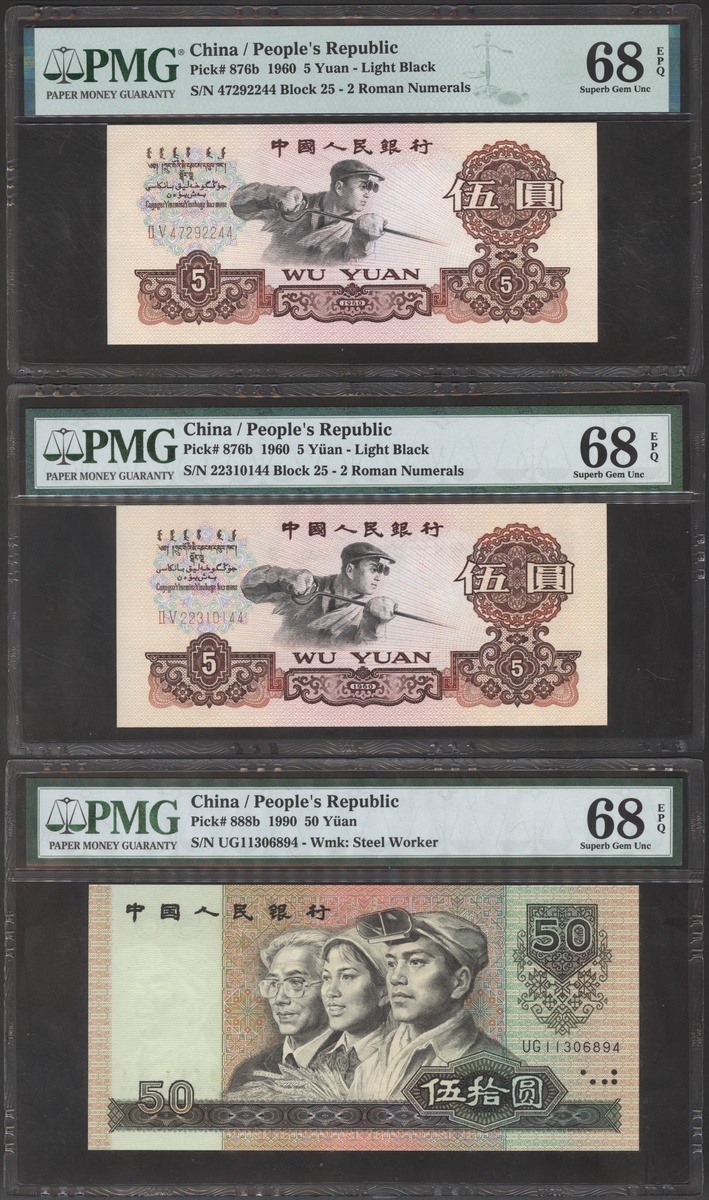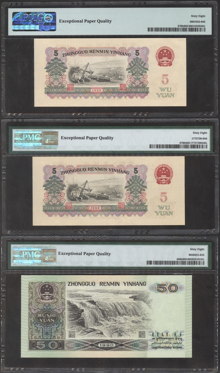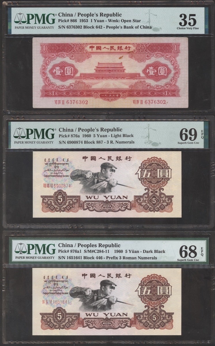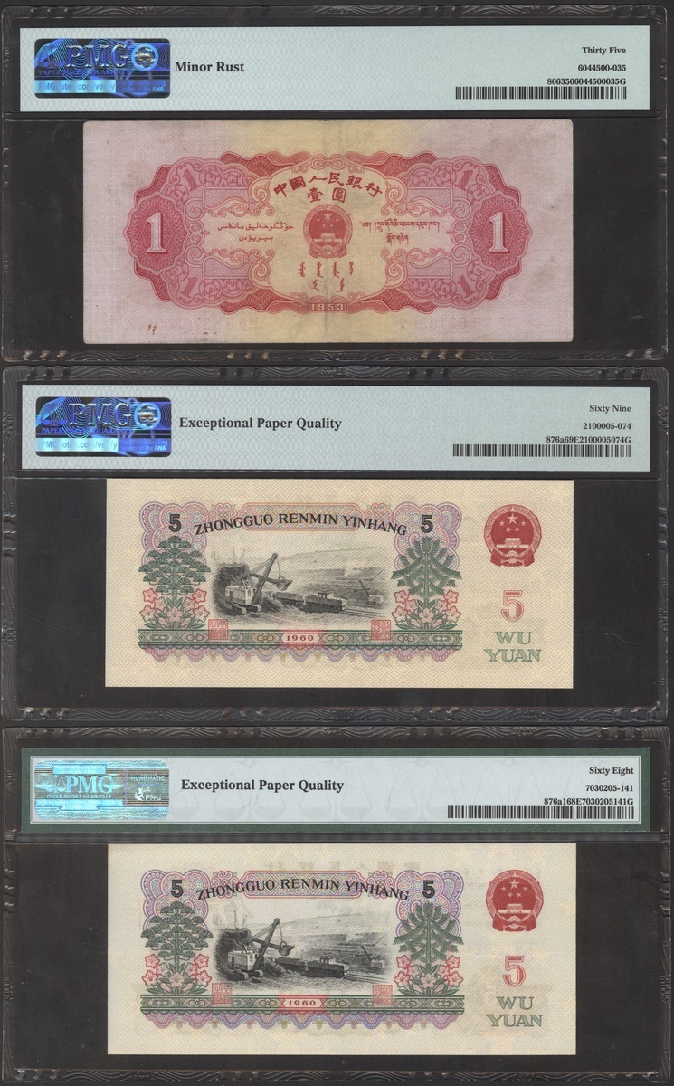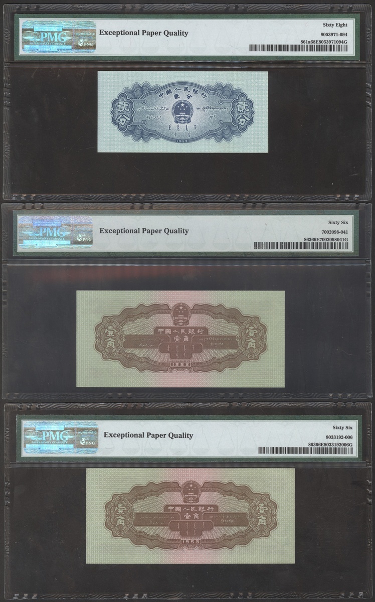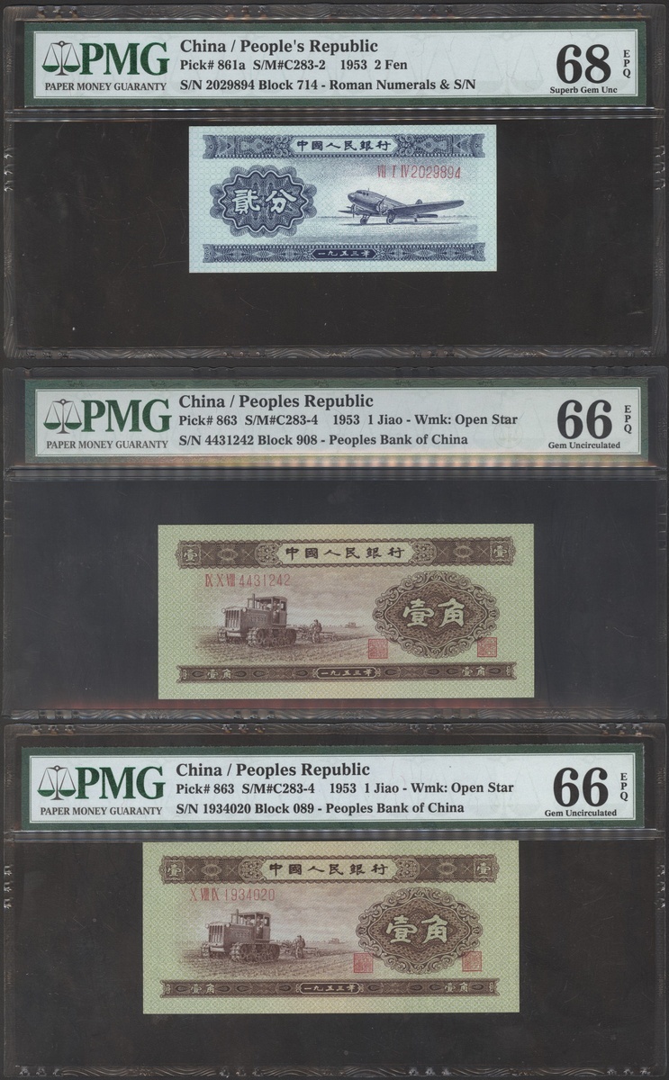People's Bank of China, 2nd series renminbi, 1953 and 1956, a group of 9 notes, consists of 2 fen, 1 jiao (2), 1 yuan, 5 yuan (4), and 50 yuan, serial numbers VII I IV 2029894, IX X VII 4431242 and X VIII IX 1934020, VI IV II 6376302, VIII VIII VII 6900874, IV IV VI 1651641, II V 47292244, II V 22310144, UG11306894, (Pick 861a, 863, 866, 876a, 876b, 888b), 1 jiao graded PMG 66EPQ, 1 yuan graded PMG 35, 1x 5 yuan 69EPQ, and the rest is 68EPQ (9).