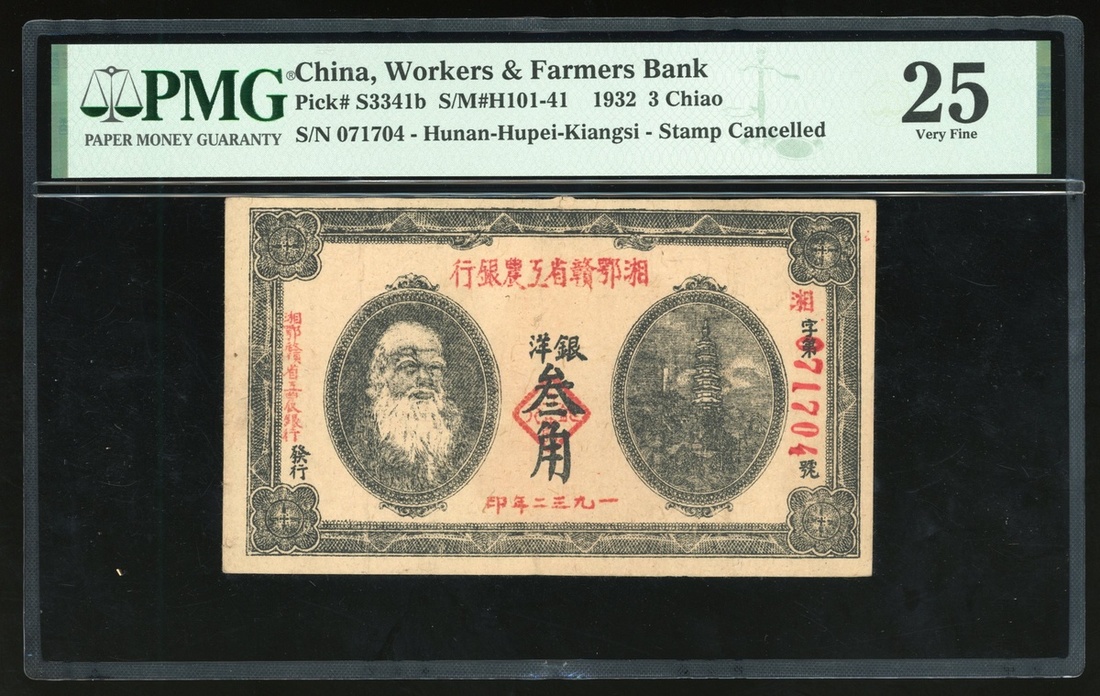 Workers & Farmers Bank, China, 3 chiao, 1932, serial number 071704, (Pick S3341b), PMG 25 Very Fine. PMG Census Top Pop. Scarce