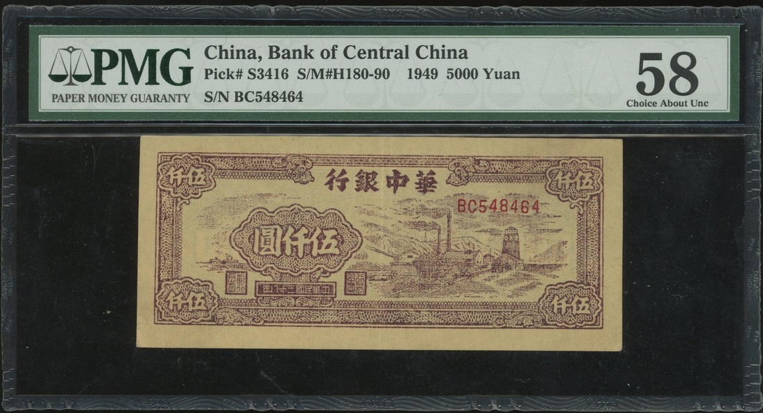 Bank of Central China, 5000 yuan, Year 38(1949), serial number BC548464, (Pick S3416), PMG 58 Choice About Uncirculated. With only 6 in higher grades, a scarce Communist era note